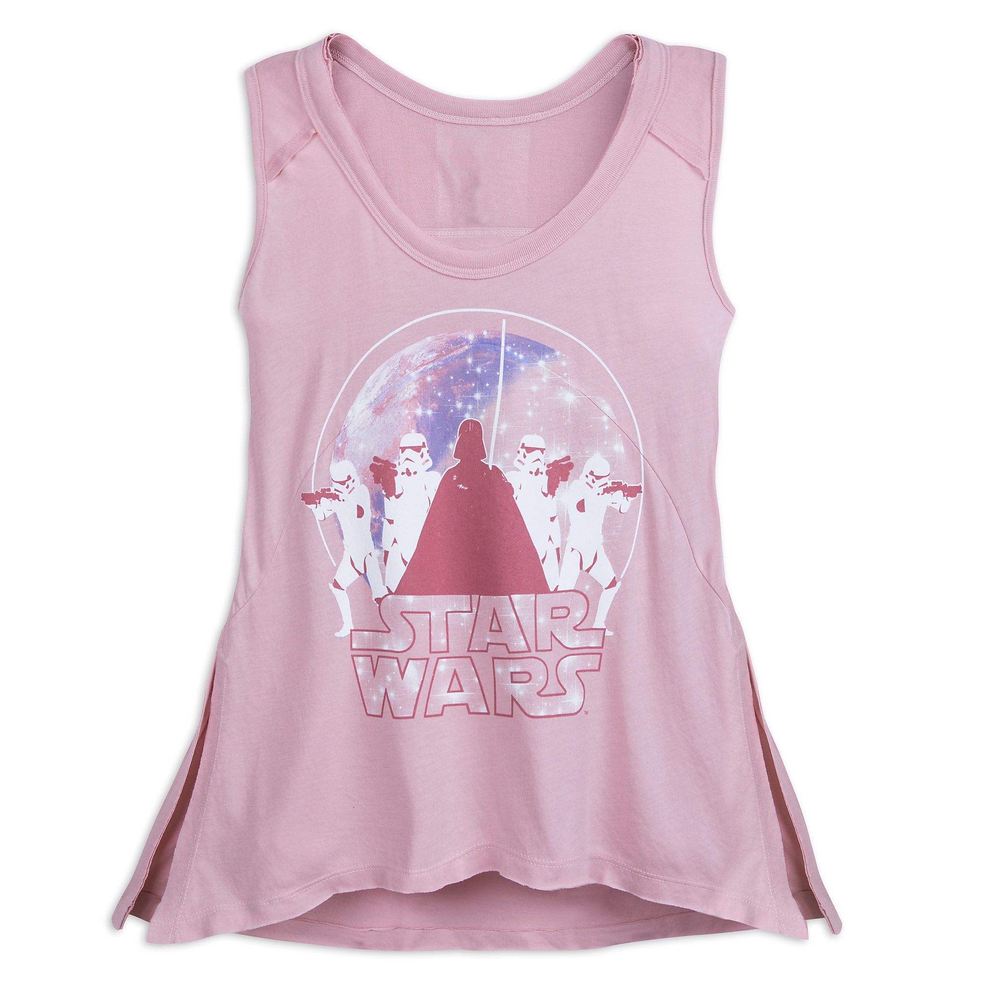 This women’s Star Wars Darth Vader tank top is available at Shop Disney. Made from 65% polyester / 35% rayon, the pink tank top features a front print of Darth Vader with Stormtroopers. The top also has raw edge accents, and side slits – I always love to see tops that add a bit of extra detail beyond a standard tank or tee.