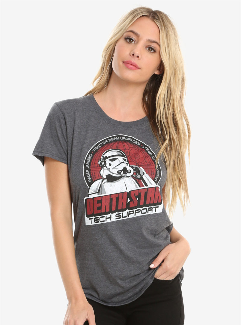 This fun new women’s Star Wars Death Star Tech Support tee is now available at Box Lunch. Made from 50% polyester, 25% cotton, 25% rayon, the women’s grey t-shirt features a front print of a Stormtrooper wearing a headset as ‘Death Star Tech Support’. The classic Death Star is in the background, surrounded by the text ‘Radar Jamming – Tractor Beam Upgrades – Laser Cannon Repair’.