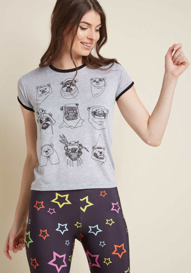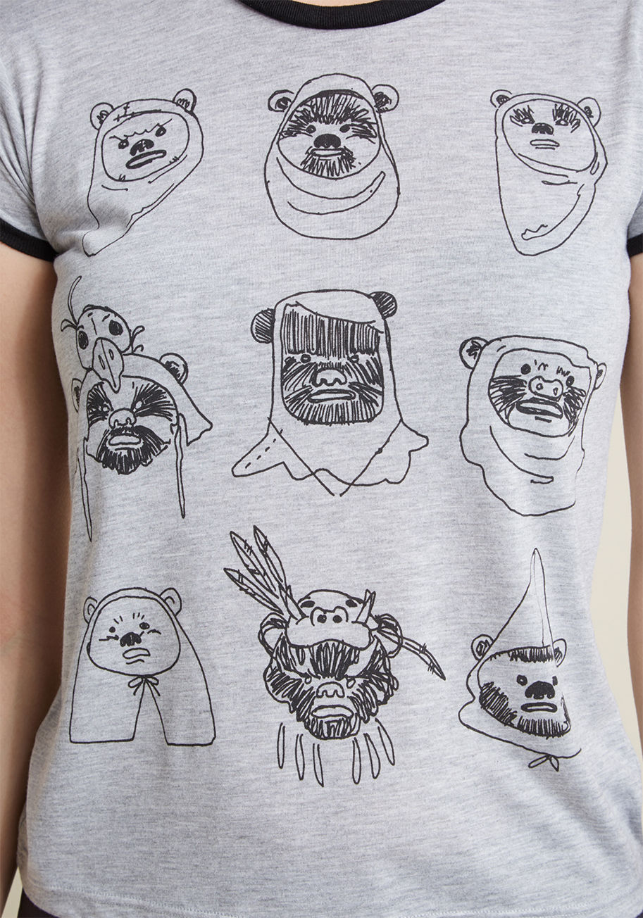 Proclaim your passion for the many eclectic looks of Endor by sporting this adorable Star Wars tee. This heather grey ringer tee features black trim and a clan of doodle-drawn Ewoks sporting a variety of trendy headgear. Alien teddies and fashion combined? Sci-fi stylistas rejoice!