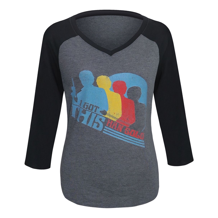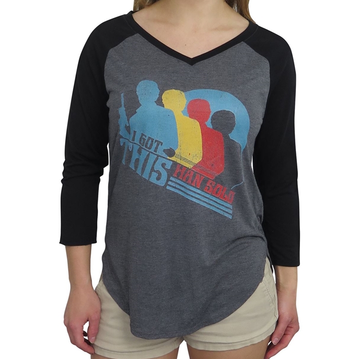 This women’s Star Wars Han Solo t-shirt is available at SuperHeroStuff. The heather grey t-shirt features a colourful print of Han Solo’s silhouette in repeat, with the text ‘I Got This’ and ‘Han Solo’. This is part of the Solo A Star Wars Story range of apparel, so the silouette belongs to young Han. The t-shirt also has raglan style black 3/4 length sleeves.