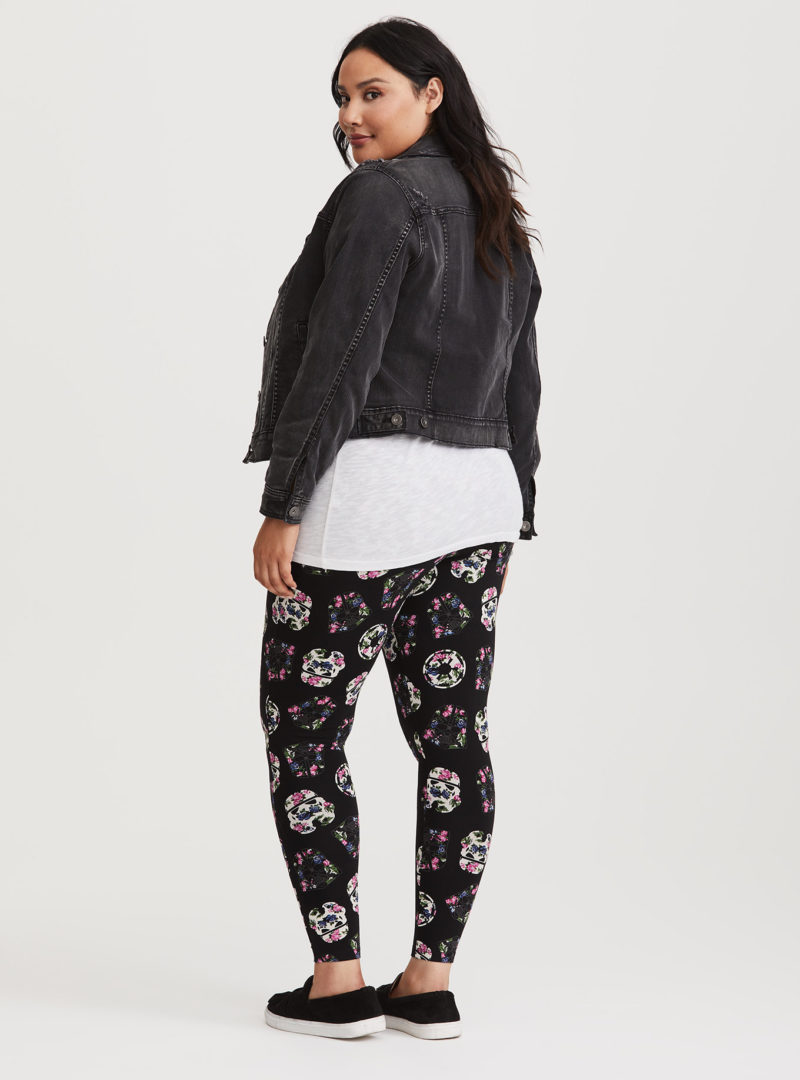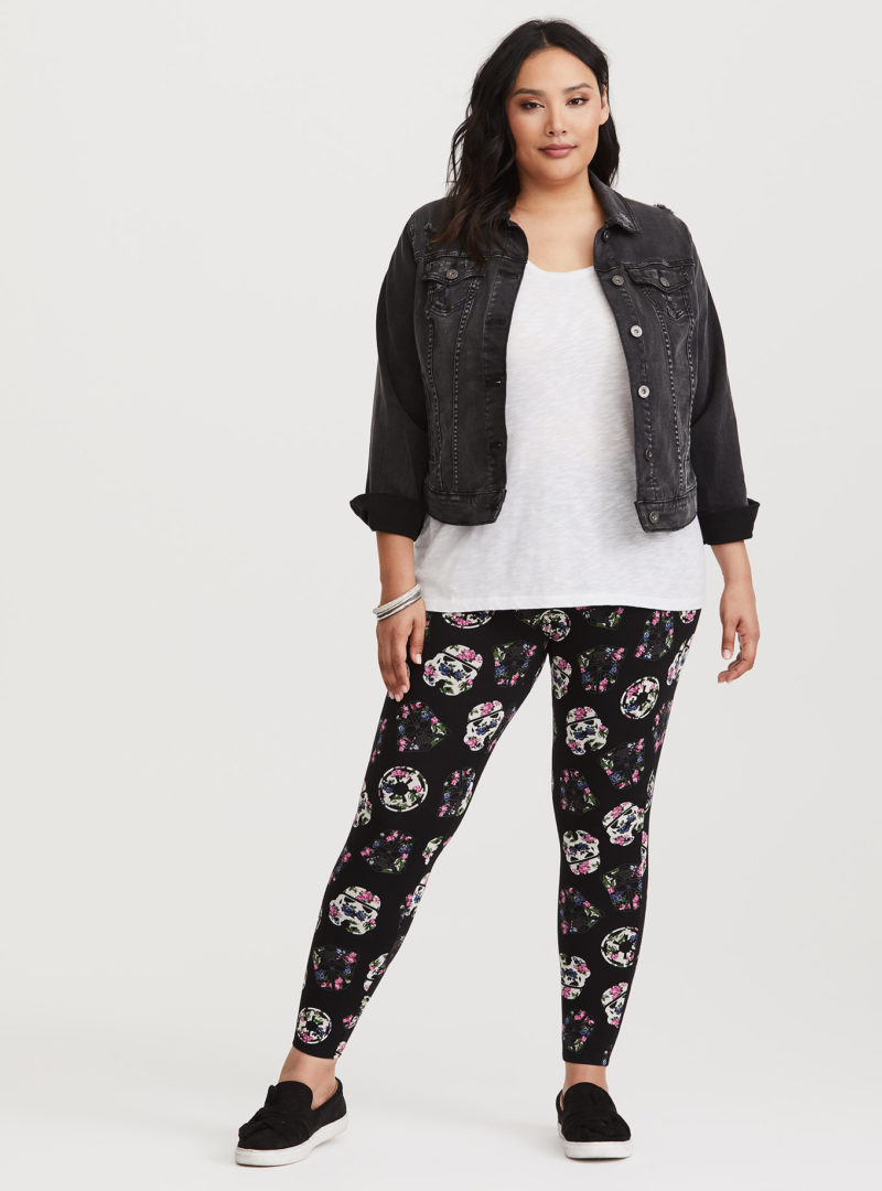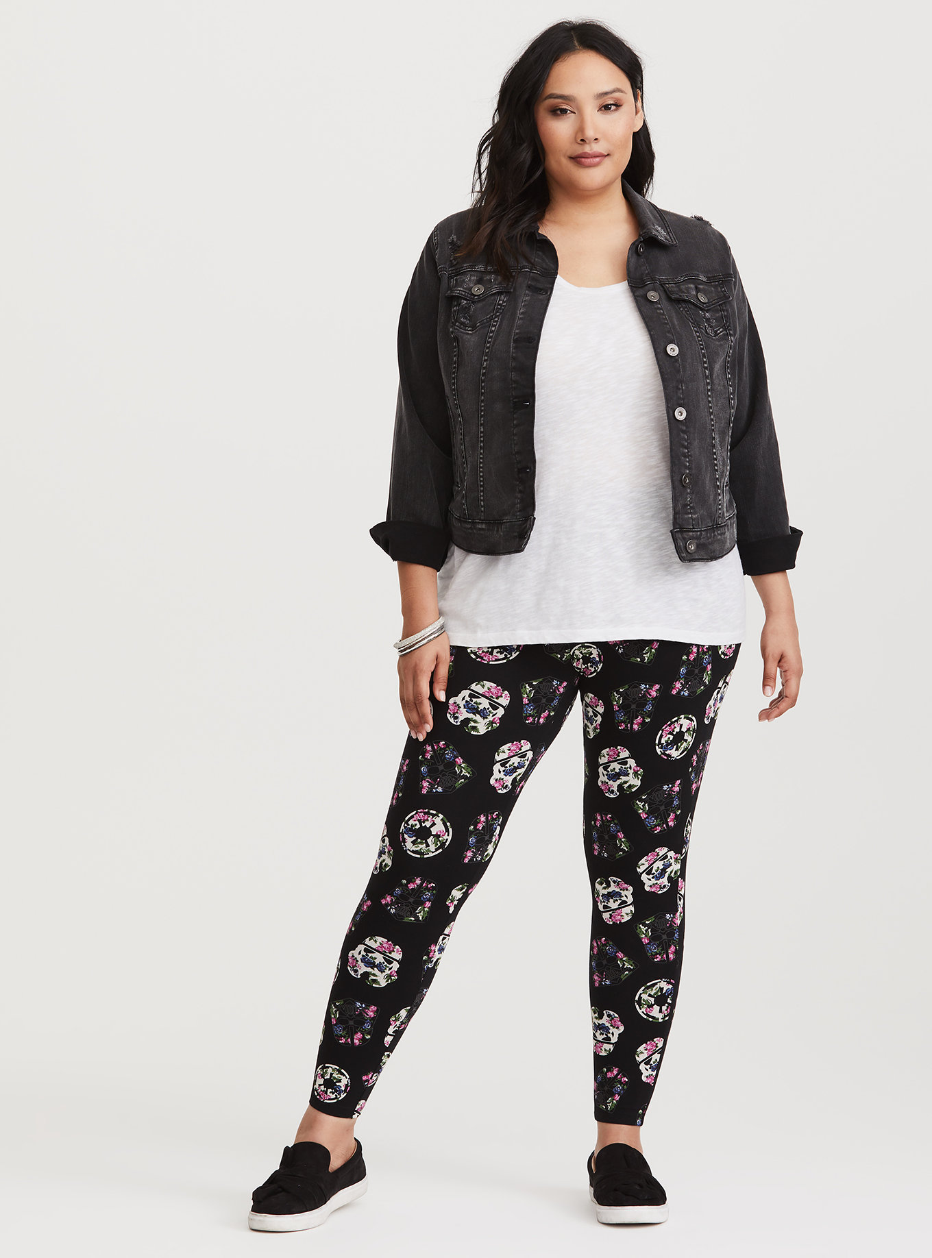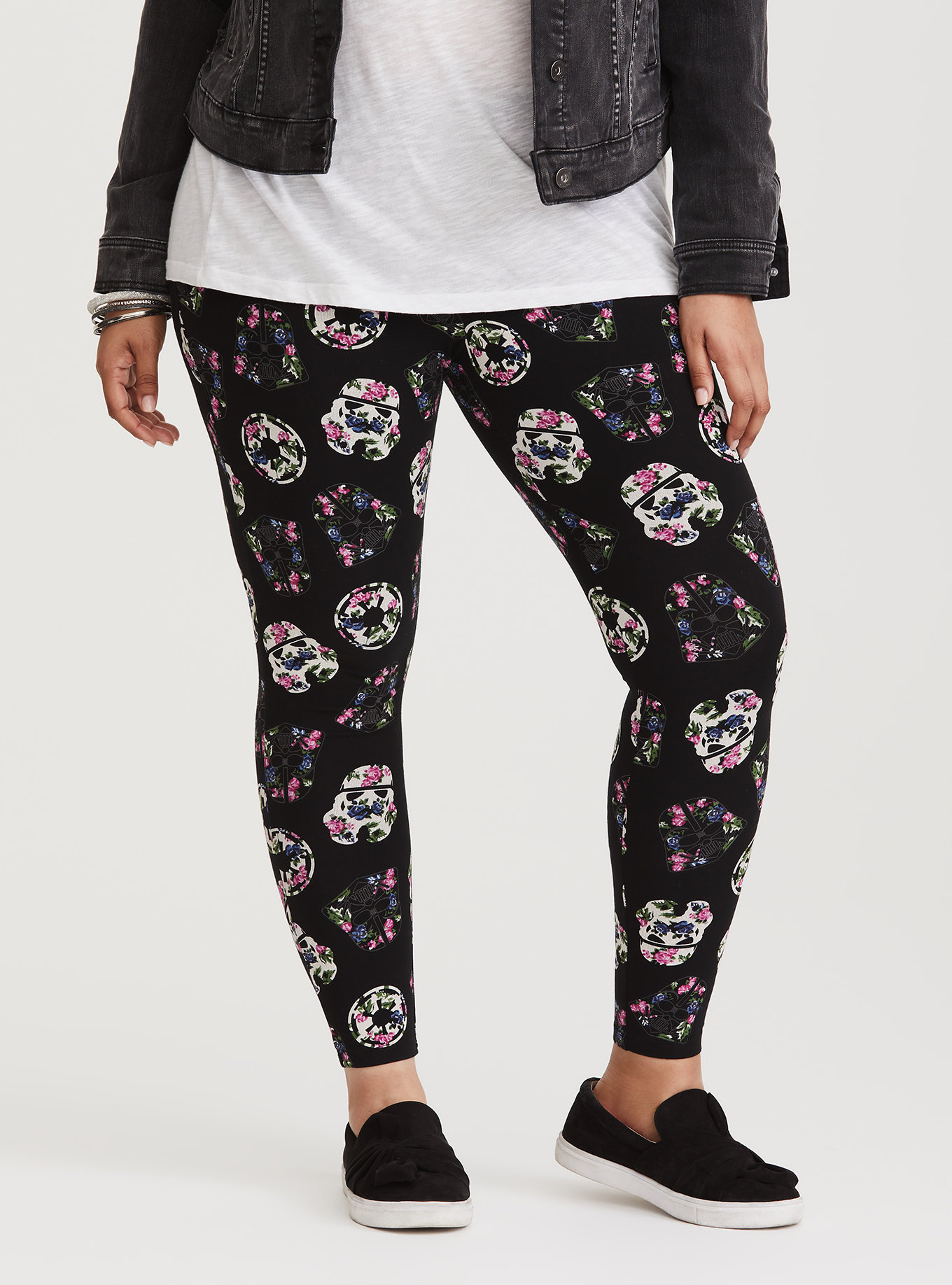 These women’s Star Wars Imperial floral plus size leggings are now available at Torrid. Made from Cotton/spandex, the black leggings feature an all-over repeating print of the Imperial ‘cog’ symbol, Darth Vader’s helmet, and Stormtrooper helmets – each filled with a floral print. Absolutely lovely!