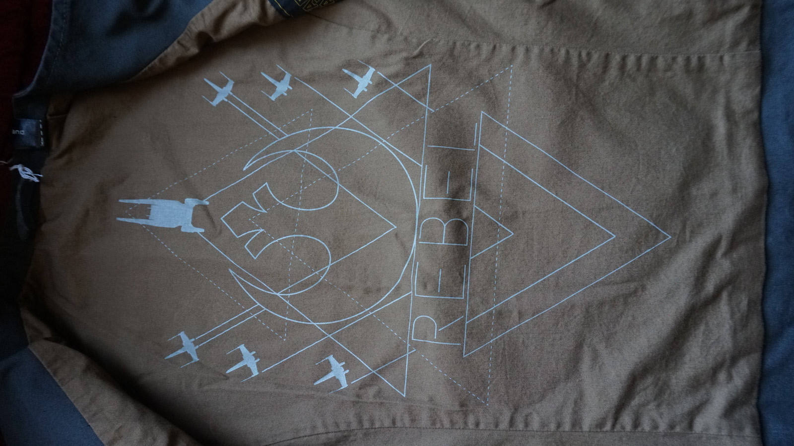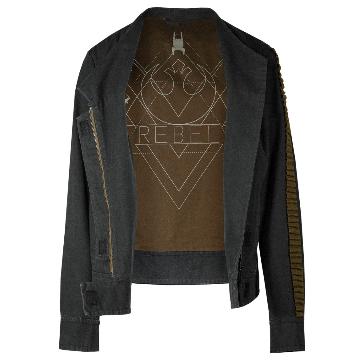 Original replica of Jyn Erso’s jacket in Rogue One: A Star Wars Story. The dark grey shell is made of durable cotton poplin fabric. The inner lining is printed with a huge Rebellion logo. The most eye-catching elements are the rippled tape on the left sleeve and the Rogue One badge on the right sleeve. Each jacket comes with a serialised production-number printed on a metal plate.