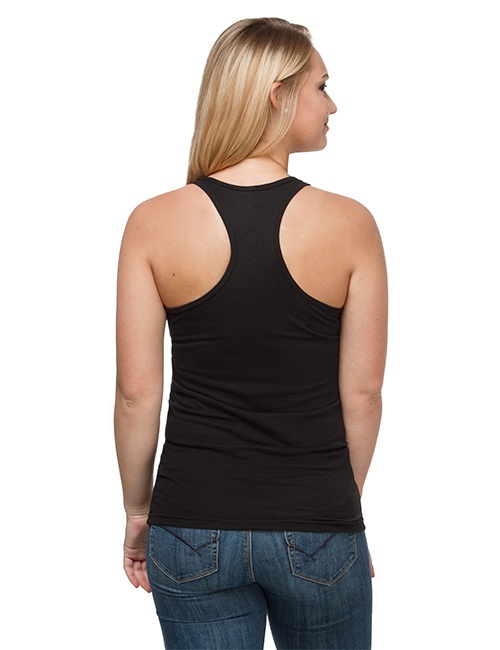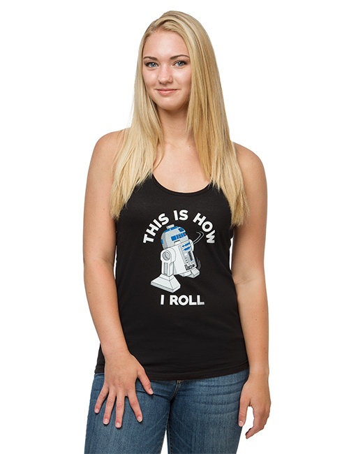 The LEGO minifig of R2-D2 shows off “This is how I roll” on the front of this black 65% polyester / 35% cotton ladies’ racerback tank top.