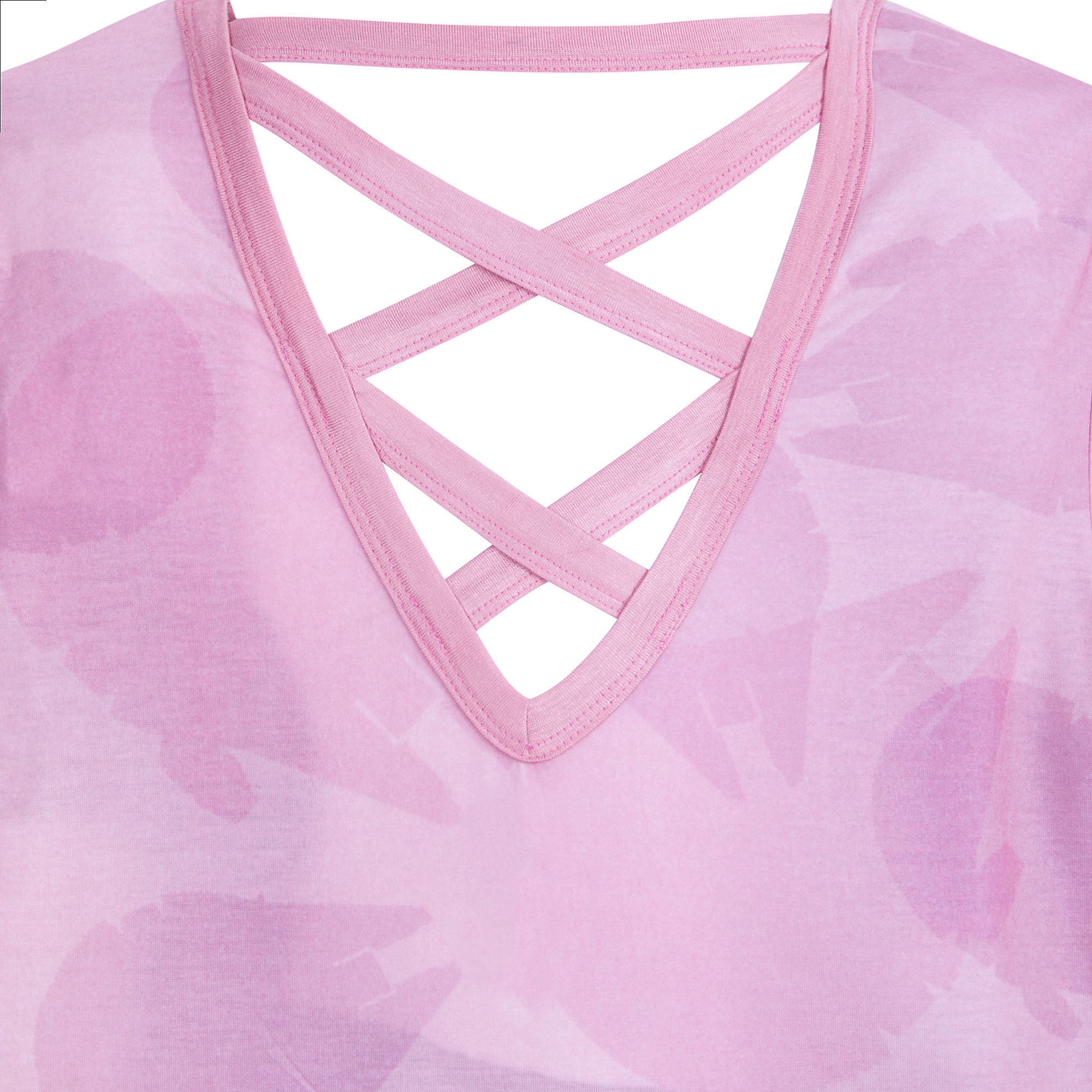 This new women’s Millennium Falcon long sleeve top is now available at Shop Disney. The pale pink top features a subtle all-over print of the Millennium Falcon silhouette, and a central front print of the Millennium Falcon silhouette with a paint splatter style. The back necklace features a cutout with crossing pink straps, which is a neat detail. The top is described as being for Solo: A Star Wars Story, but the version of the Millennium Falcon used for this top has the classic front ‘cut out’ shape, not the ‘filled in’ version as seen in Solo advertising.
