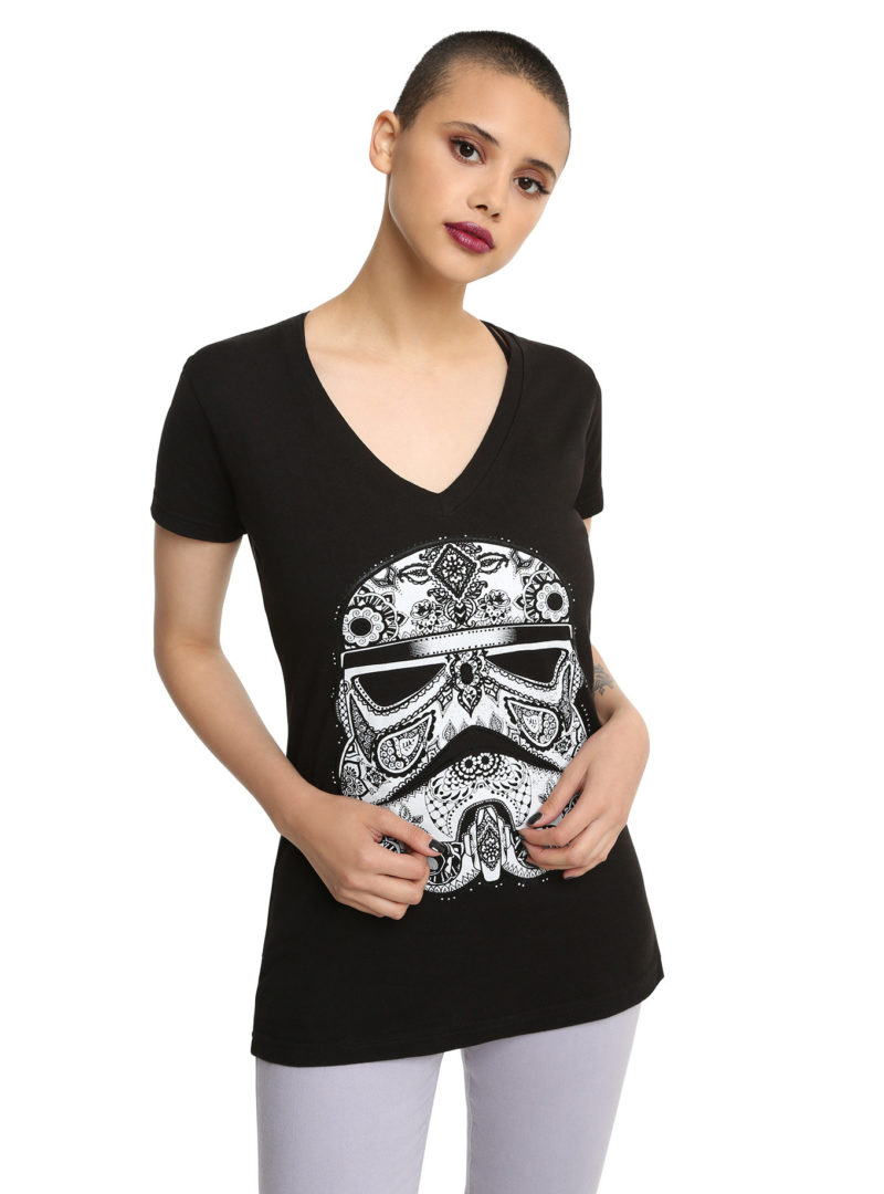 This new women’s Star Wars paisley Stormtrooper t-shirt is now available at Hot Topic. The black v-neck t-shirt is made from 100% cotton, and features a white paisley style design of a classic Stormtrooper helmet.