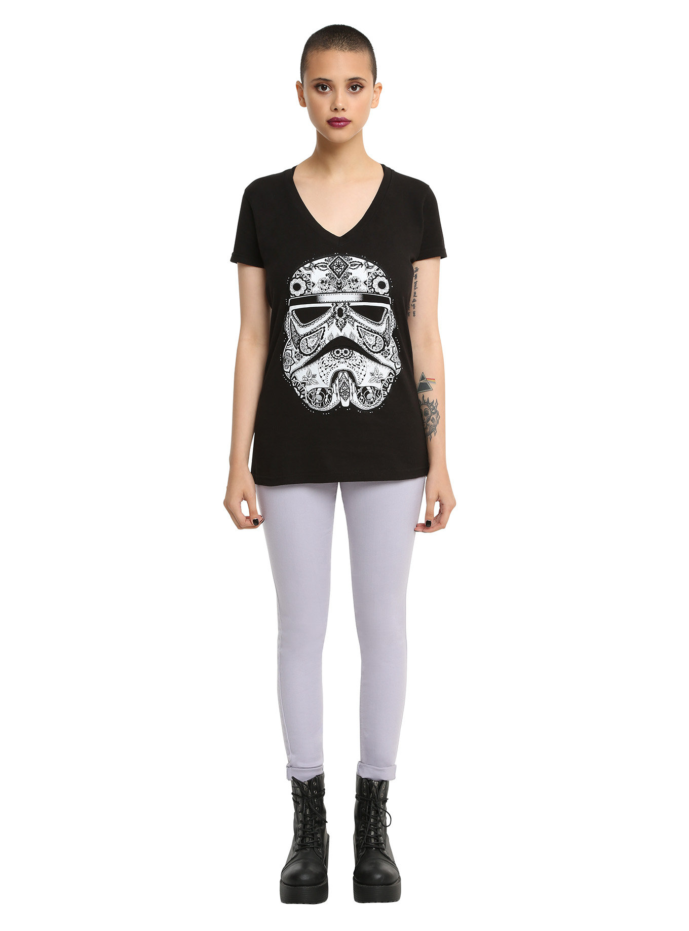 Sci-fi geek meets boho chic on this fitted black V-neck tee from Star Wars. Design features a large black & white paisley print stormtrooper helmet design with glossy black details.