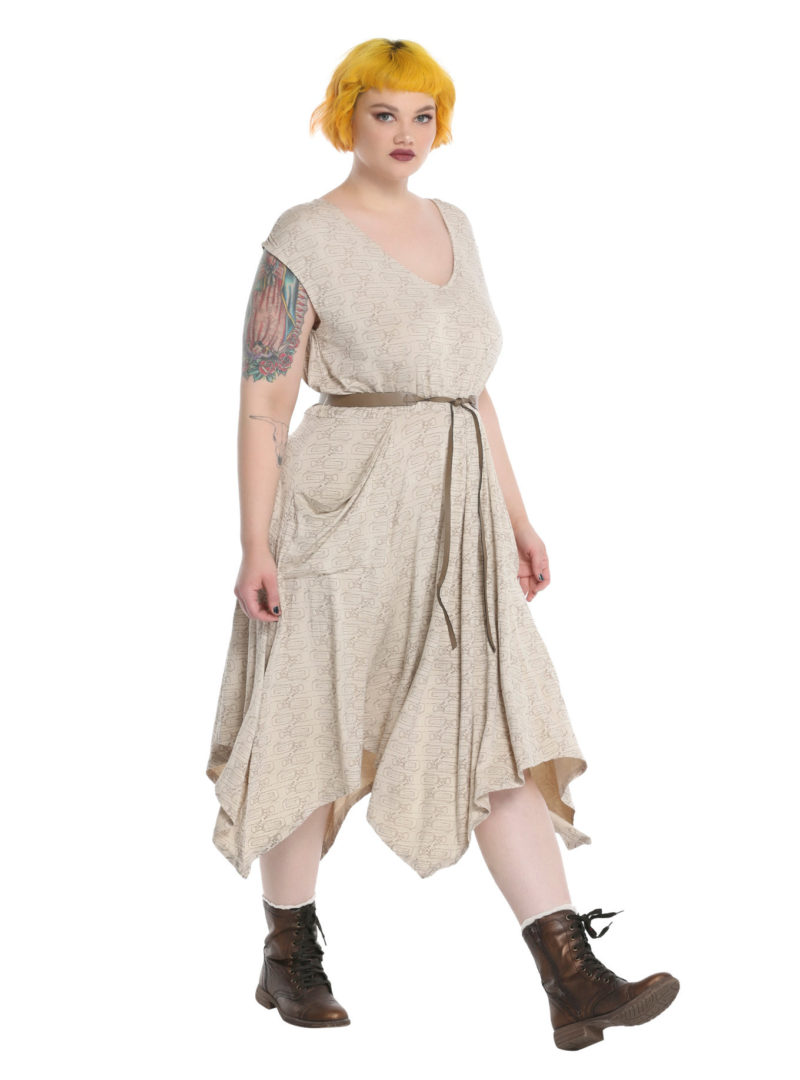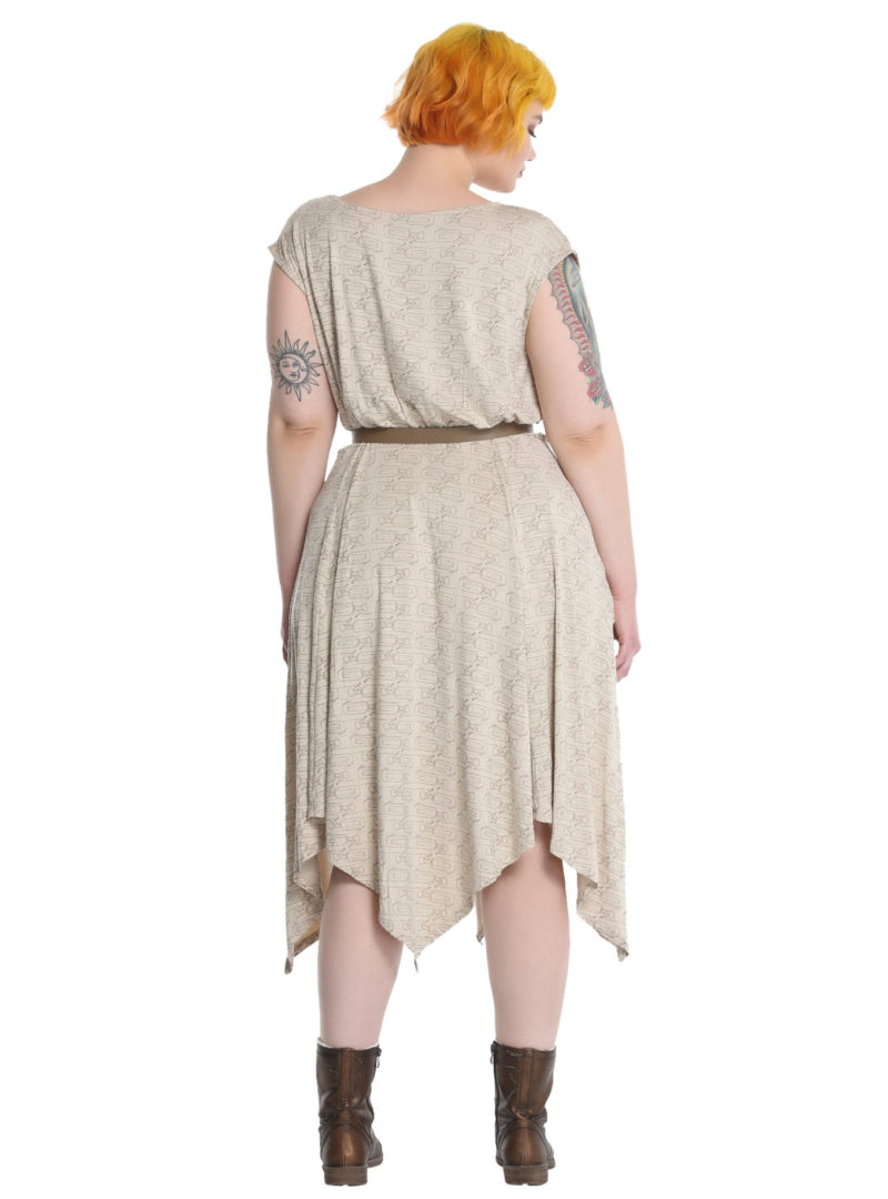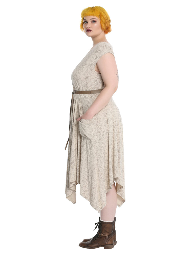 The women’s plus size Her Universe Rey dress is now available at Hot Topic. Released a couple of weeks ago in standard sizes, the long awaited Rey dress is now available in plus sizes too. Part of the Star Wars Episode 7 collection designed by the winners of the Her Universe Fashion Show last year, the beige dress features an all over light brown print of Rey on her Jakku speeder. The sleeveless dress also features front pockets, a faux leather belt, and a handkerchief style hemline.