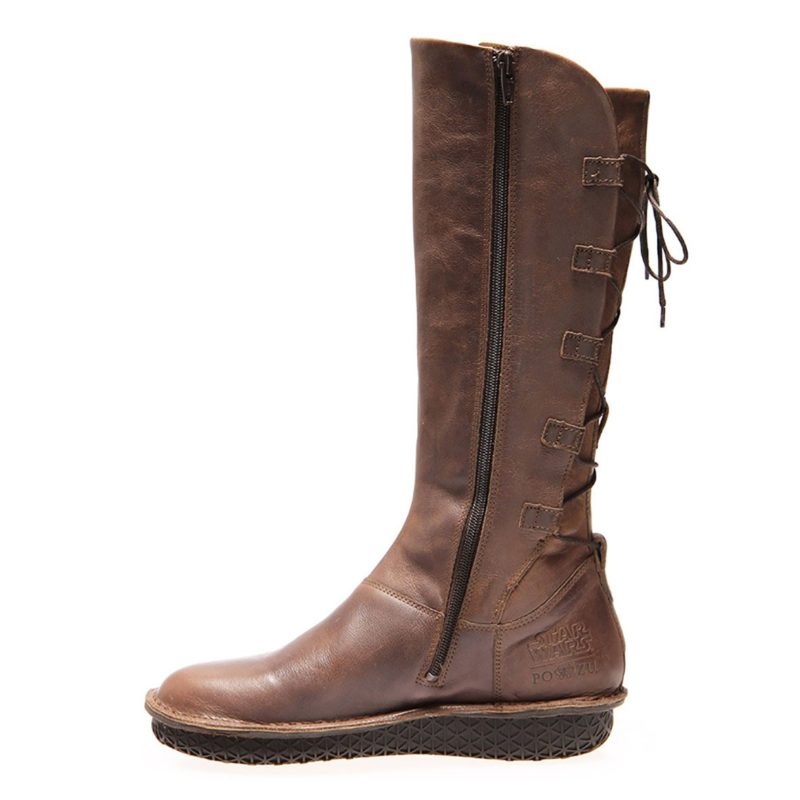 Po-Zu have celebrated Force Friday with a very exciting release – the Rey hi boot! After the first full-length photos of Rey from The Last Jedi were released, I had my fingers crossed that Po-Zu would release a version of her new tall boots so fans could add them to their wardrobes! The gorgeous brown boots feature Po-Zu’s distinctive design, very reminiscent of Rey’s original boots, with lacing up the back.