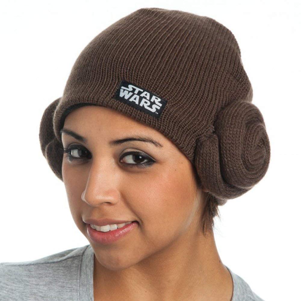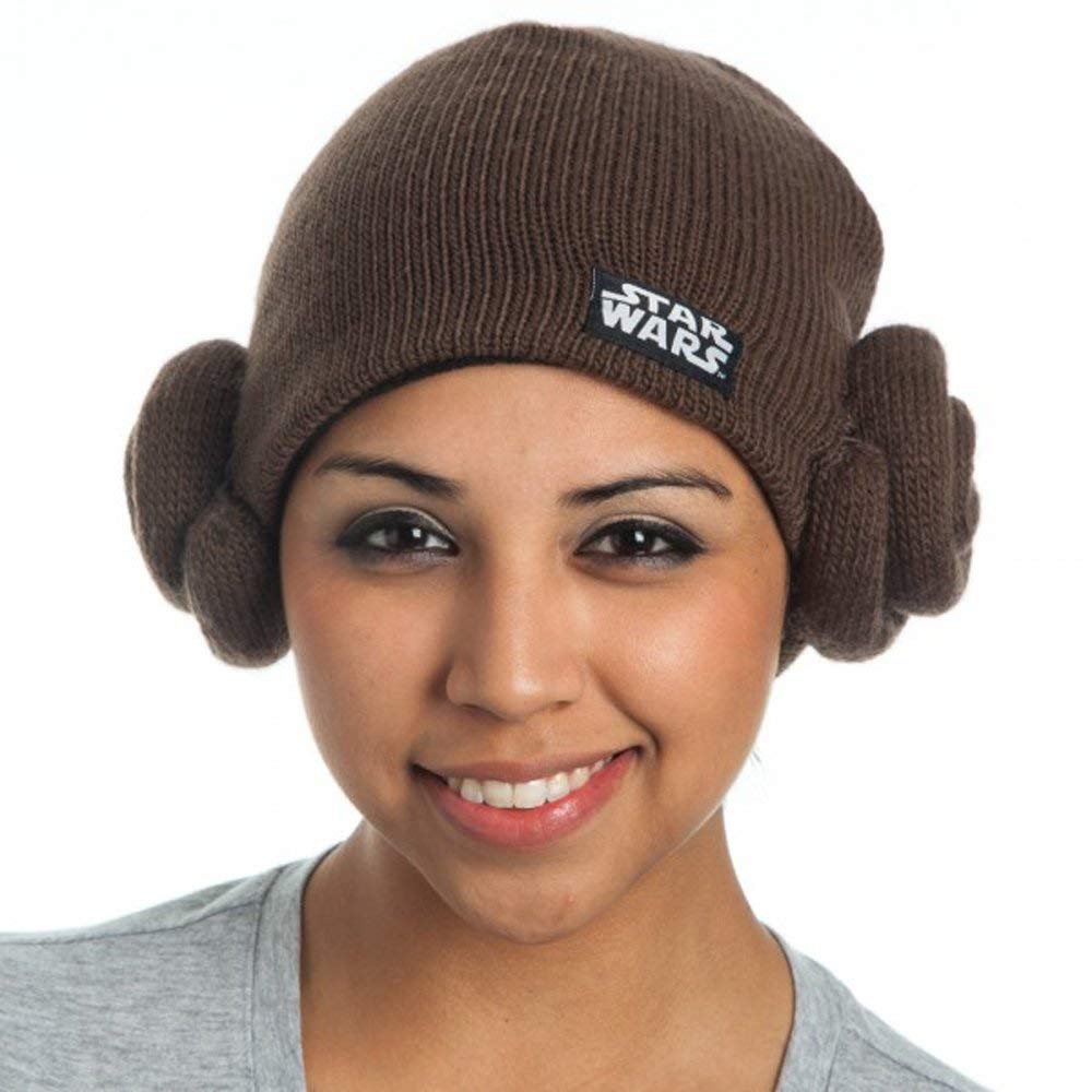 This women’s Star Wars Princess Leia knit beanie is available on Amazon. The brown knit beanie replicates Princess Leia’s classic bun hairstyle, with a spiral-shape ‘hair bun’ sewn onto each side. The front also features a fabric Star Wars logo patch. A fun hat for colder weather, and perfect for a fun Princess Leia ‘everyday cosplay’ style outfit.
