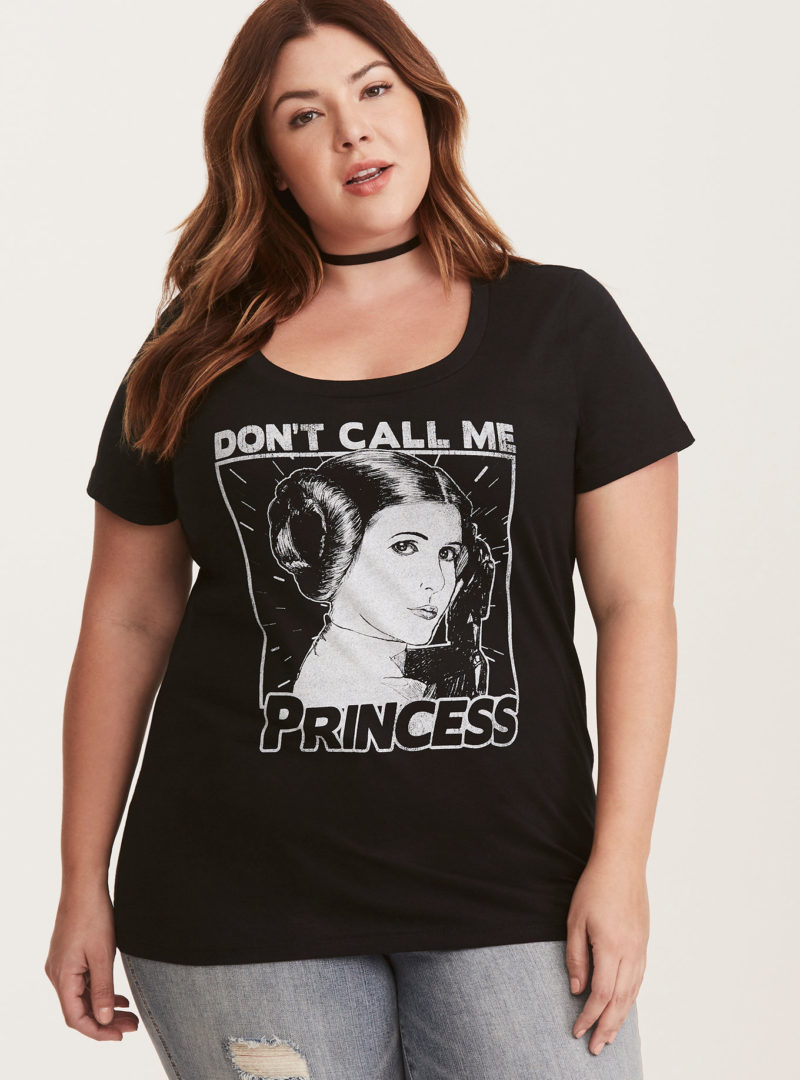 This new women’s Star Wars Princess Leia t-shirt is now available at Torrid. The black t-shirt features a front print of Princess Leia, with the text ‘Don’t Call Me Princess’.