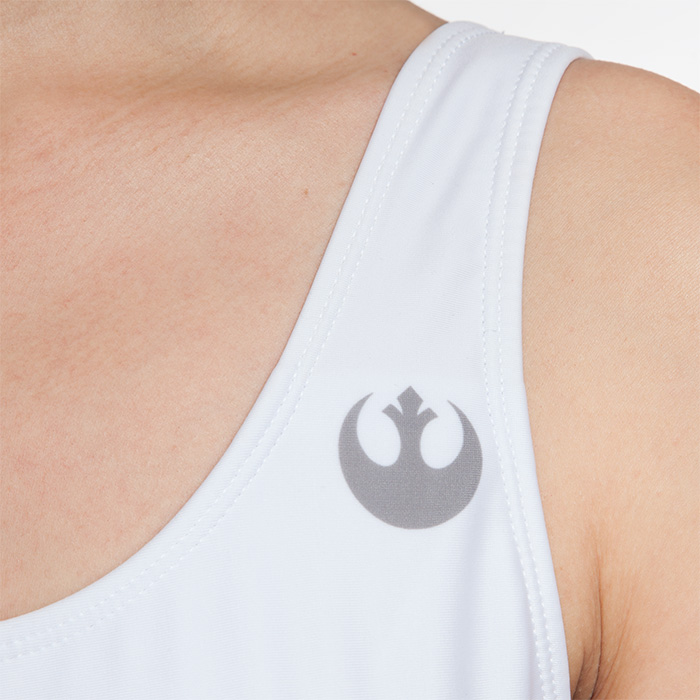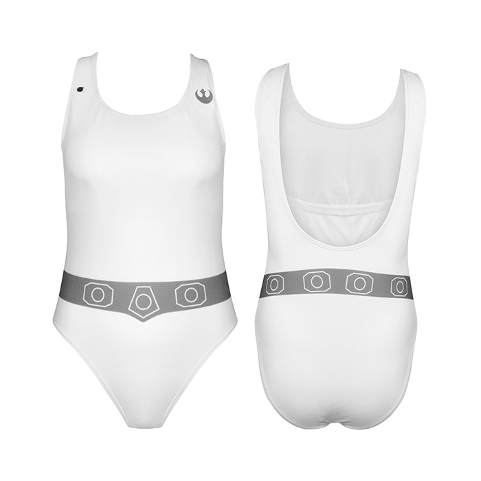 The new Musterbrand x Star Wars Princess Leia swimsuit is now available at ThinkGeek! Previewed back in early February, the Princess Leia swimsuit is part of a new women’s Star Wars swimwear collection by Musterbrand. The one-piece style swimsuit is inspired by Princess Leia’s classic white outfits from A New Hope, with a printed silver belt detail, referencing the one worn with her ceremonial gown.