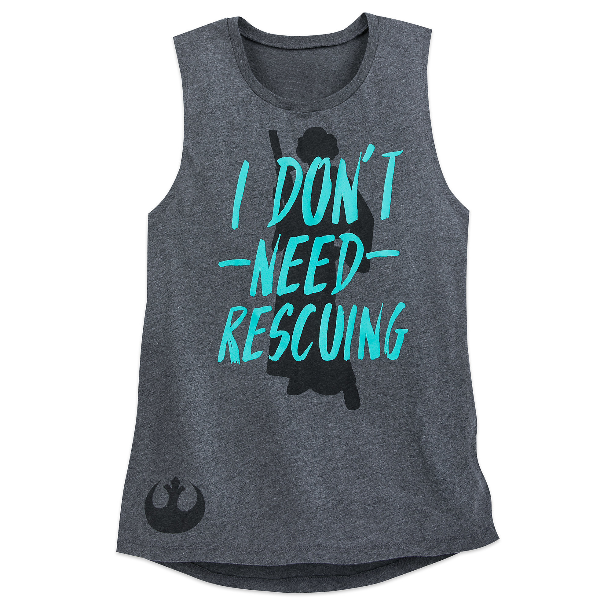 This women’s Princess Leia tank top is now available at Shop Disney. The heather grey muscle-cut tank top features a front print of Princess Leia’s silhouette, with the text ‘I Don’t Need Rescuing’ printed across her.