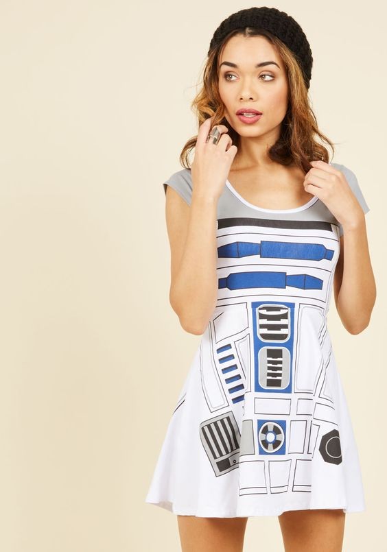 ModCloth has a women’s R2-D2 skater dress available. The stretch knit dress features a skater style skirt, scoop neckline, and short sleeves. The all-over ‘everyday cosplay’ style print features R2-D2’s classic features on the front and back.