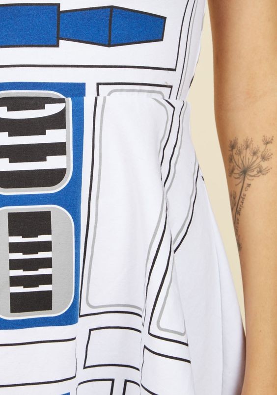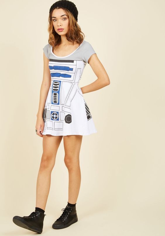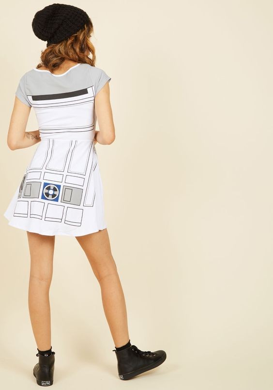 Your quirky-cool ensembles are a major source of joy, so go ahead – move full ‘Force’ to euphoria by donning this jersey knit dress! Decorated with a grey and white pattern inspired by cheeky astromech droid R2-D2, this entertaining, geek-chic frock is a worthwhile whim for your wardrobe.