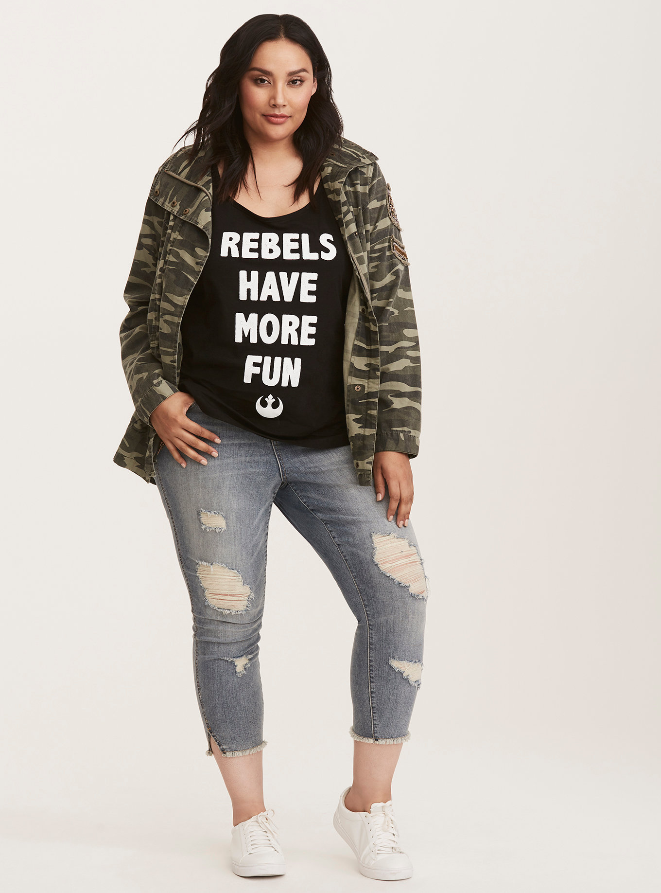 This new women’s Star Wars Rebels Have More Fun plus size tank top is now available at Torrid. The black racerback style tank top features a front white print of the text ‘Rebels Have More Fun’, with the Rebel Alliance symbol underneath.