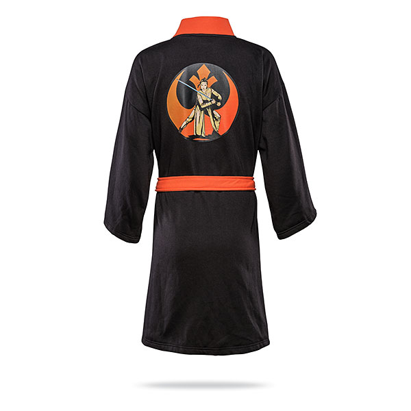 This new women’s Rey Rebel robe is now available at ThinkGeek. Made from 100% polyester jersey, the black bath robe features a printed image of Rey on the back, and a text ‘Rey’ embroidered on the upper left chest. The contrast neck binding and waist tie coordinate with the orange tones of the Resistance logo print on the back.