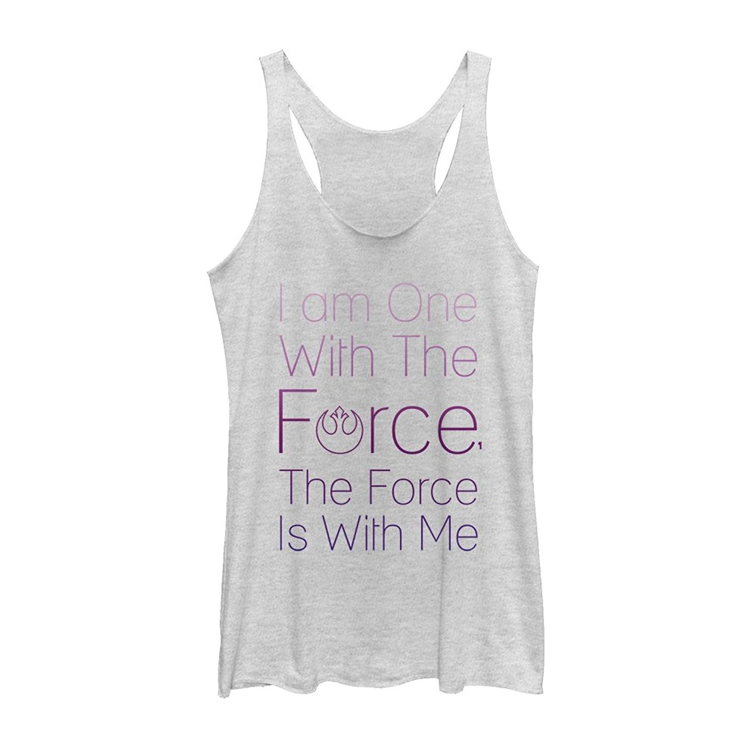 Channel the power of the Force through the Star Wars Rogue One Chirrut One with Force Heather White Racerback Tank Top! Chirrut Imwe’s iconic mantra “I am One with the Force, the Force is with Me” fades across this soft light gray Rogue One tank top in a fun ombré style purple print.