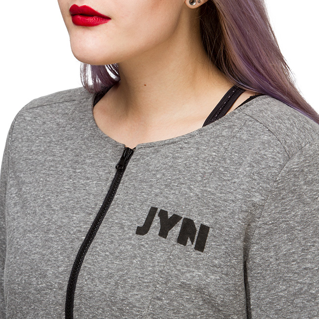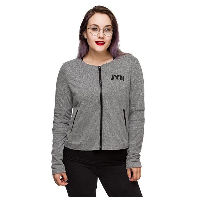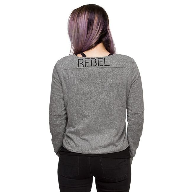 This new women’s Rogue One Jyn Erso jacket is now available exclusively at ThinkGeek. The grey heather jacket features the text ‘Jyn’ printed in black on the upper left chest, and the text ‘Rebel’ is printed in black on the back underneath the neckline. The jacket closes with a contrasting black zipper, and there are 2 front pockets.