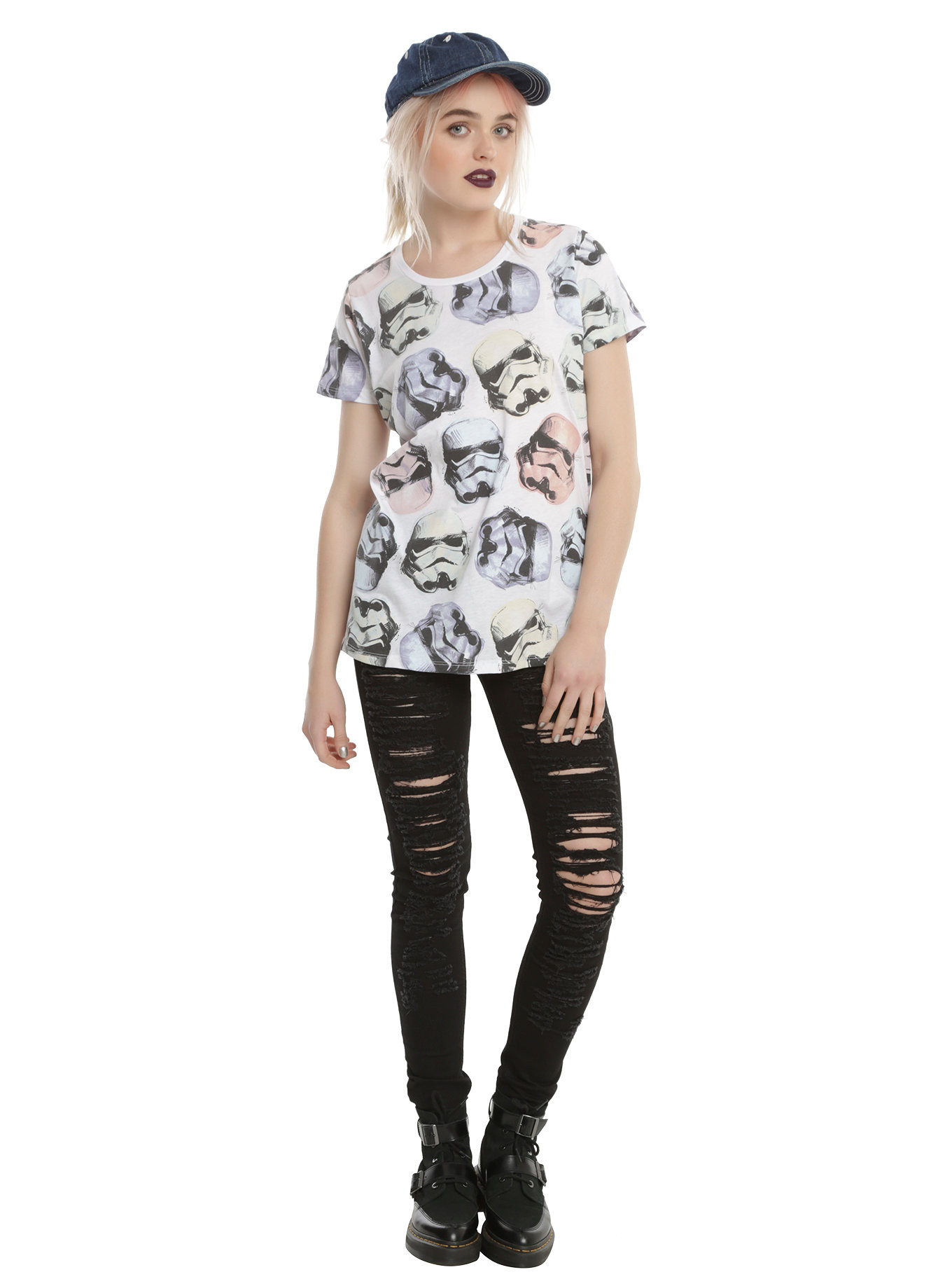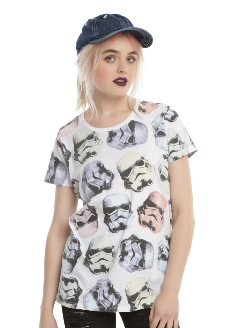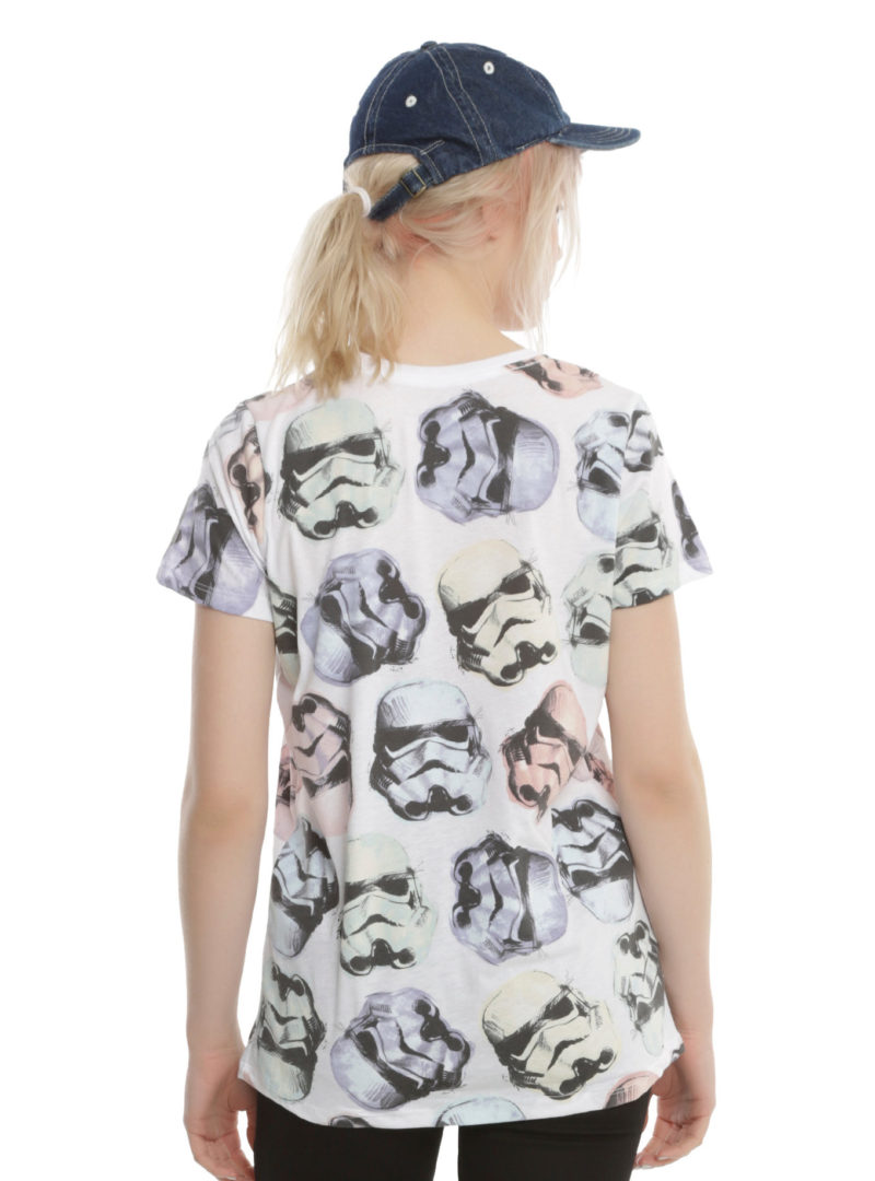 Hot Topic has a new women’s Star Wars Rogue One t-shirt available. Made from 50% cotton, 50% polyester, the white t-shirt features an all-over design of the classic Stormtrooper helmet, accented with pastel tints.