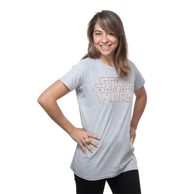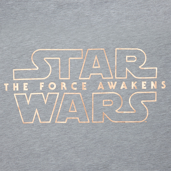 Thinkgeek has a new women’s Star Wars t-shirt available. The heather grey t-shirt features a front print of the Star Wars The Force Awakens logo, printed in rose gold foil. Simple, classic design – I love the pairing of light grey and rose gold colours.