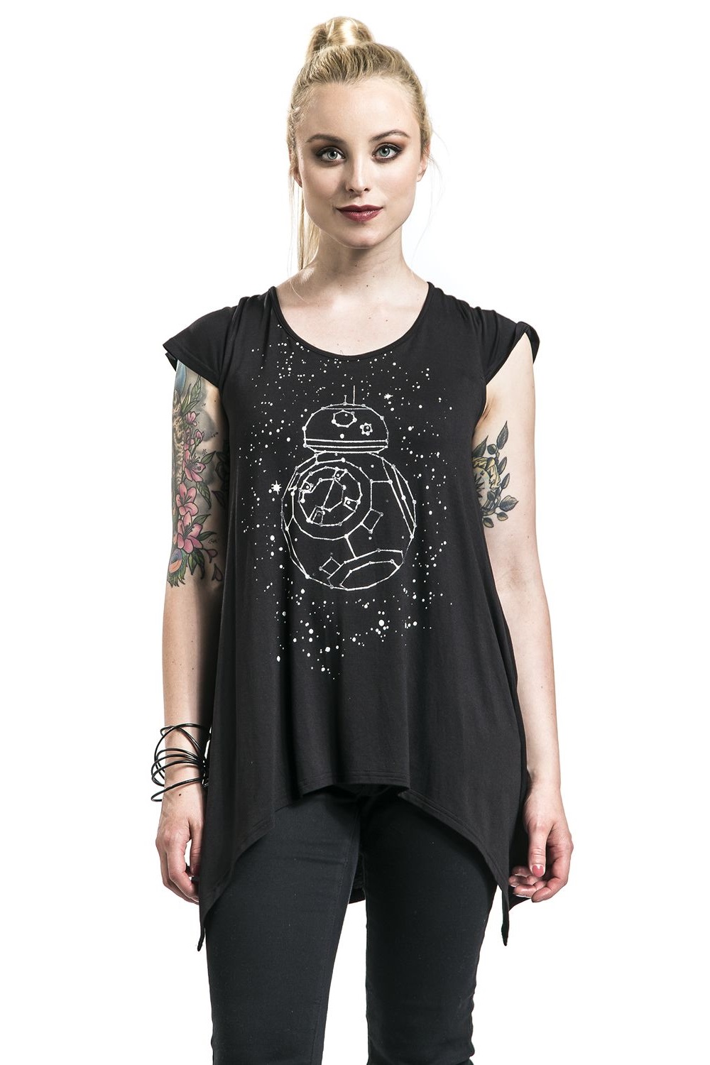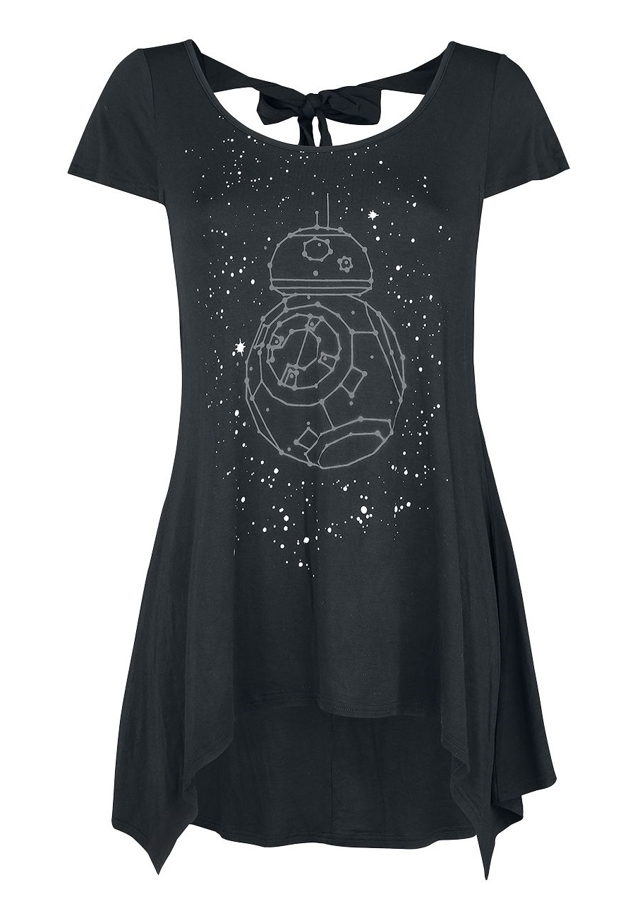 This women’s Star Wars BB-8 Galaxy top is available at EMP Online. Made from 95% viscose, 5% elastane, the black top features a front print of BB-8 in constellation-style artwork against a starry sky. The draped top features a ‘shark bite’ style front hem, and a cut-out at the back neckline accented with a long bow.