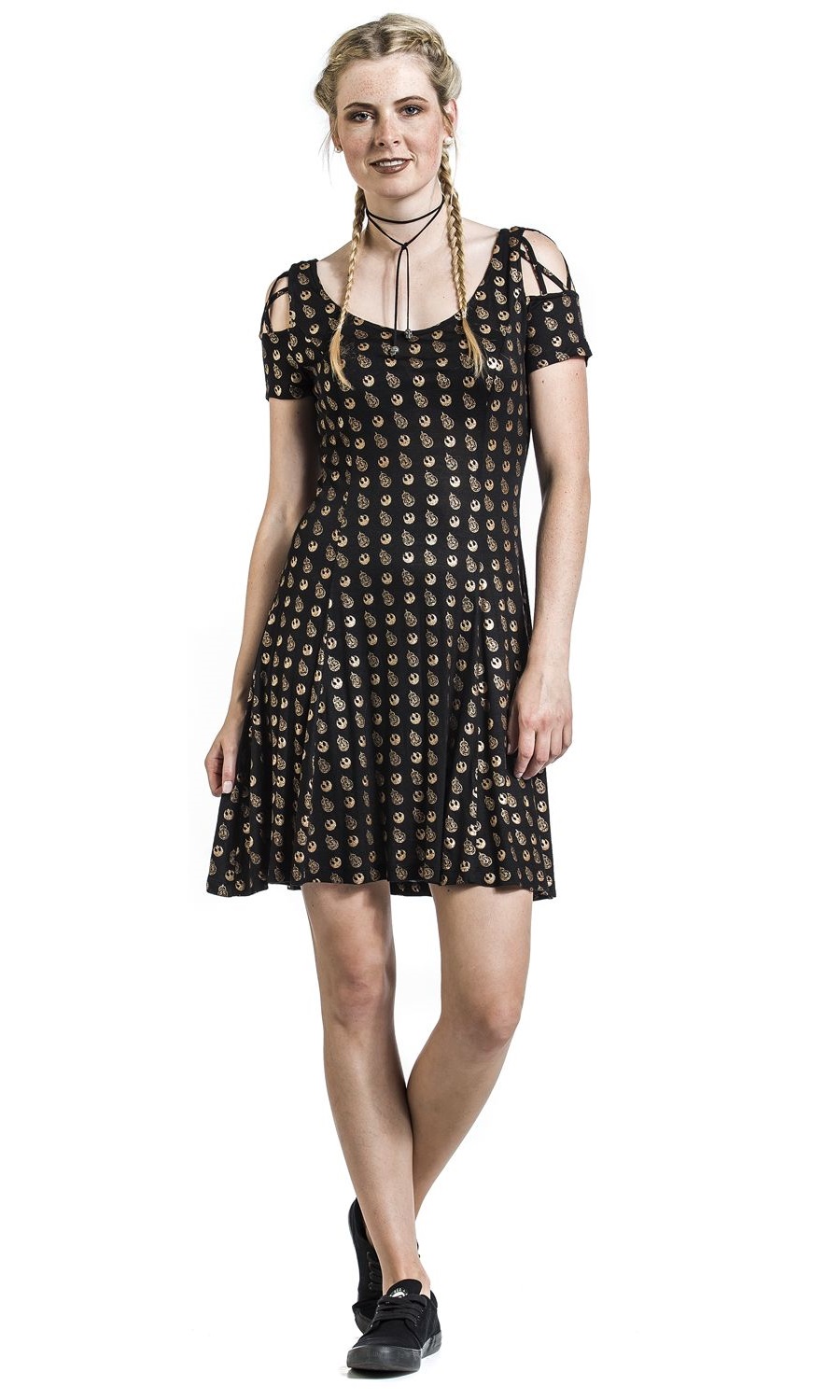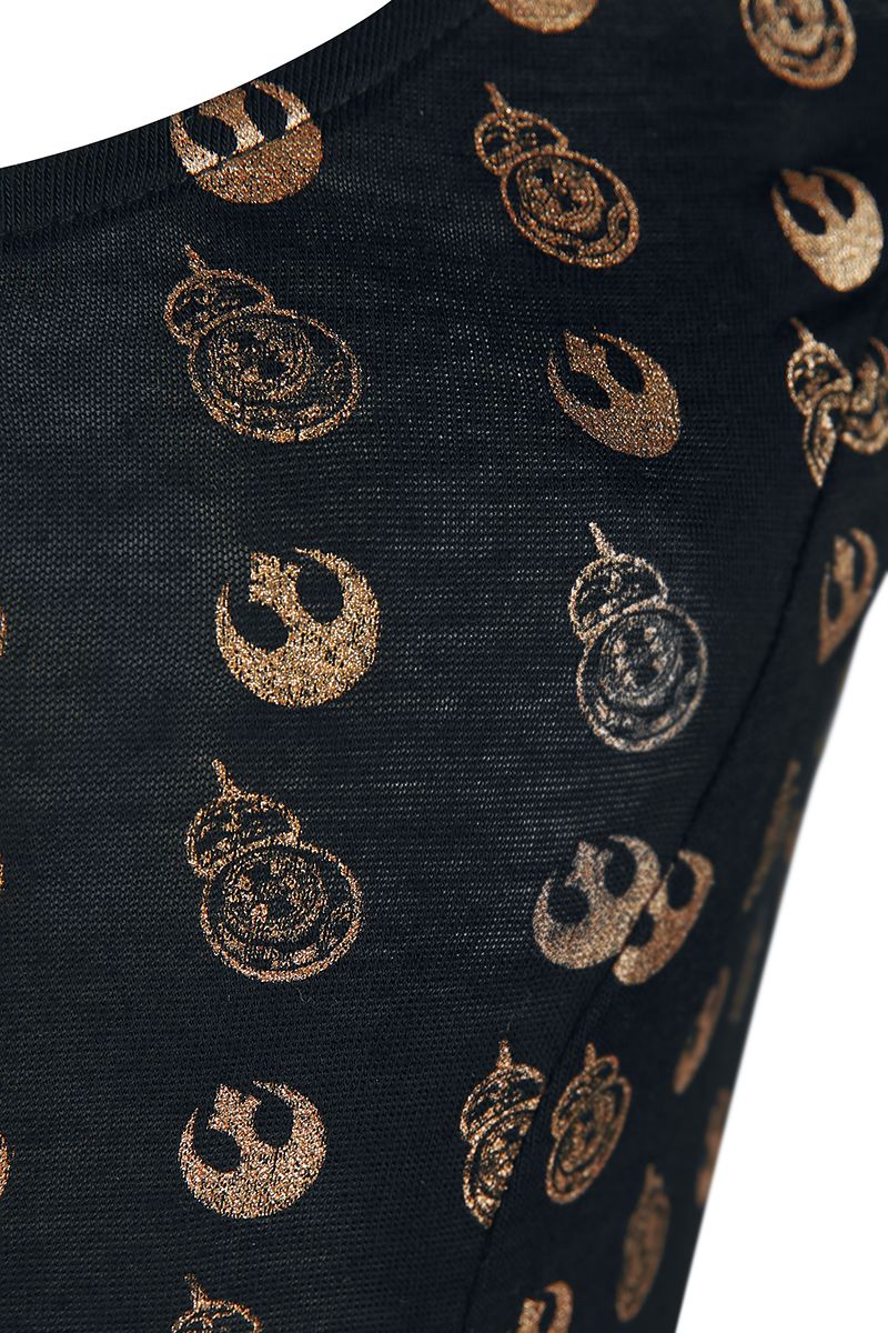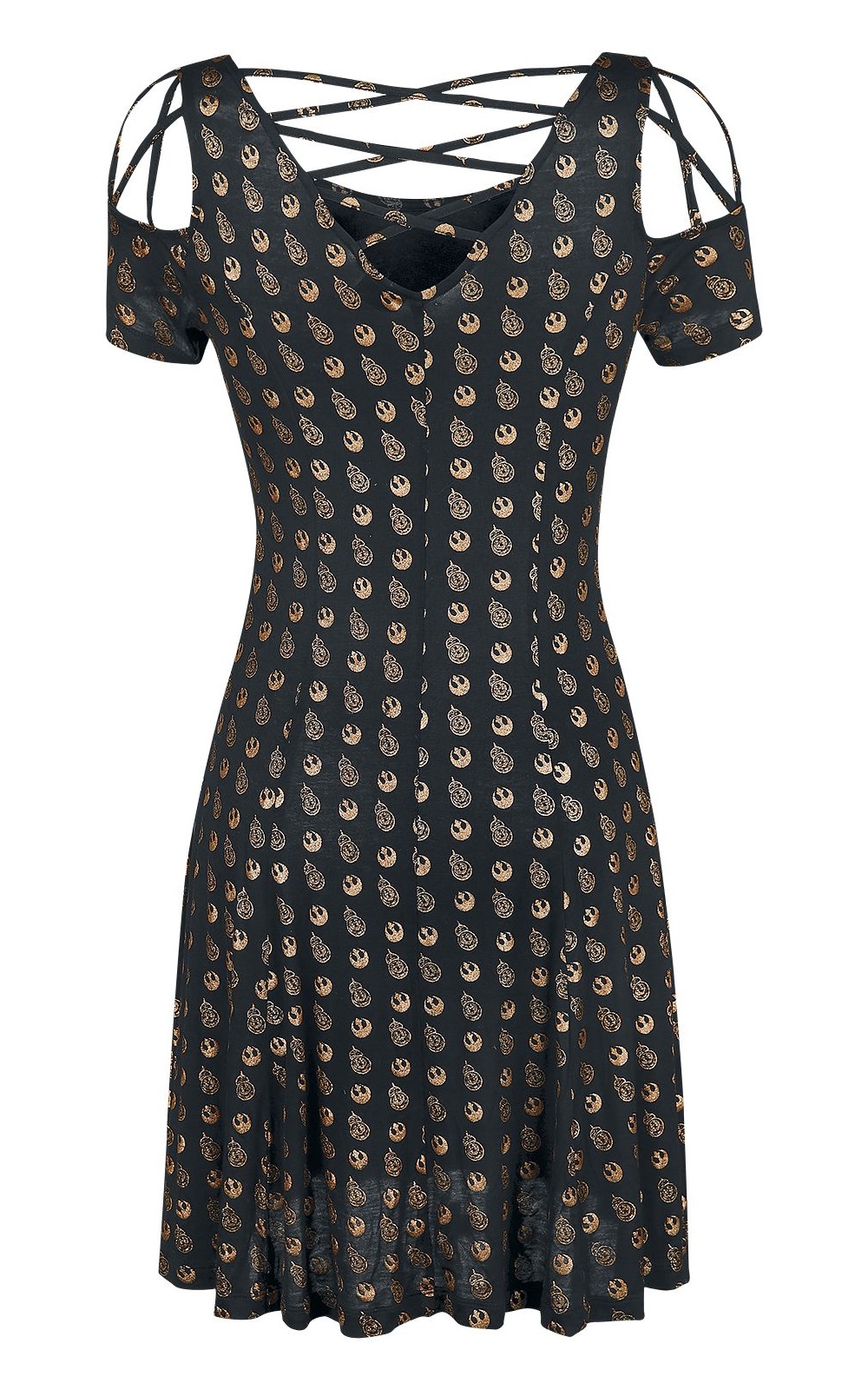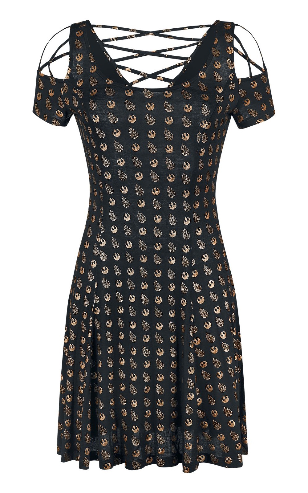 This fantastic Star Wars BB-8 gold print dress is now available at EMP Online. Made from 95% viscose, 5% elastane, the black dress features an all-over metallic gold print of BB-8 and the Resistance ‘starbird’ symbol. The dress also has cutouts on the shoulders, with criss cross decorative straps across the grap, and straps across the low v-shape back neckline.