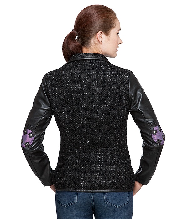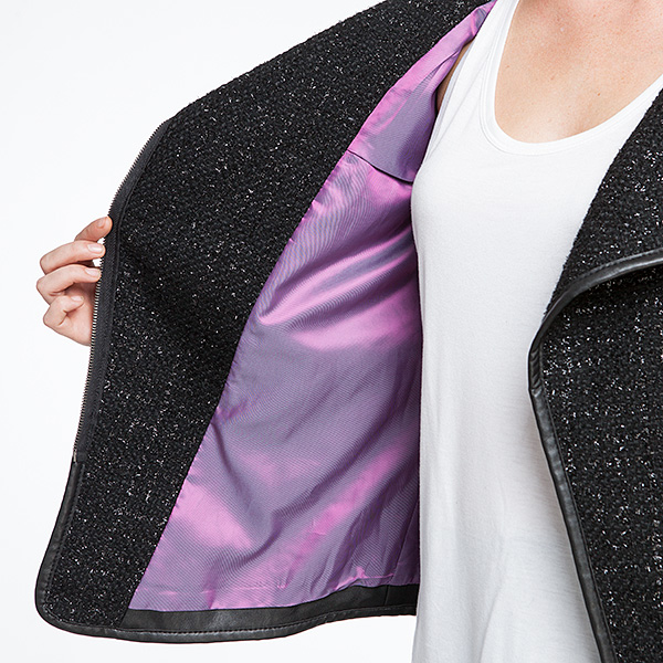 This awesome new women’s Star Wars BB-9E draped jacket is now available exclusively at ThinkGeek. The asymmetrical black motorcycle-style jacket is made from a sparkly textured knit with contrast faux leather sleeves. The elbows feature patches that resemble panels on BB-9E, while the interior lining is a gorgeous purple iridescent fabric printed with a ‘Rule The Galaxy’ design. The finishing touch is a bonus BB-9E pin on the lapel.