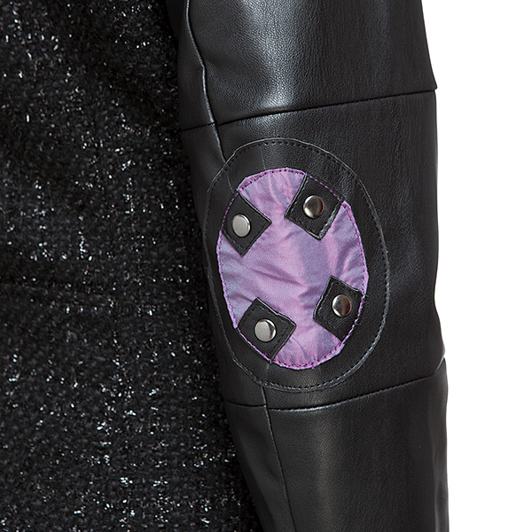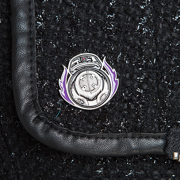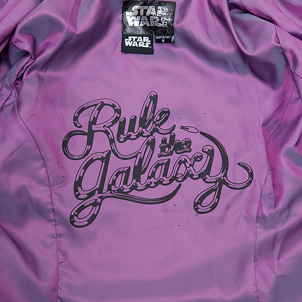 This asymmetrical full-zip motorcycle-style jacket is perfect for anyone whose loyalties tend more to the Dark Side of things. The front sides create a rounded hem when zipped, and the sparkly bouclé knit body has faux leather sleeves and details. Those sleeves feature elbow patches that look like BB-9E’s panels, done up in lavender for a little extra punch. And speaking of extra “punch,” the purple iridescent lining reads “Rule the Galaxy” with a TIE Silencer for emphasis.