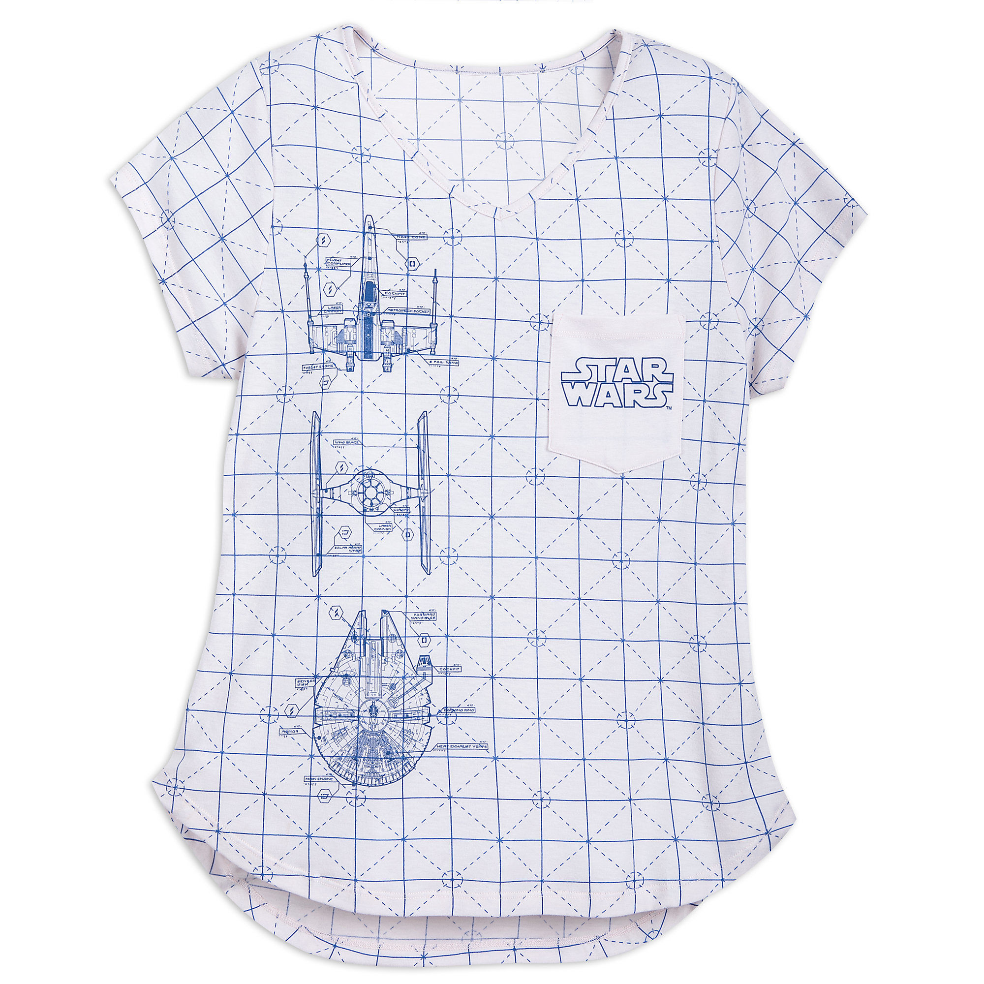 This women’s Star Wars blueprint t-shirt is available at Shop Disney. Made from 70% polyester / 25% rayon / 5% spandex, the t-shirt has an all-over blueprint style print, with three classic Star Wars vehicles featured on the front – X-Wing Fighter, TIE Fighter, and the Millennium Falcon. The t-shirt also features a small pocket on the upper left chest with the Star Wars logo printed on it.