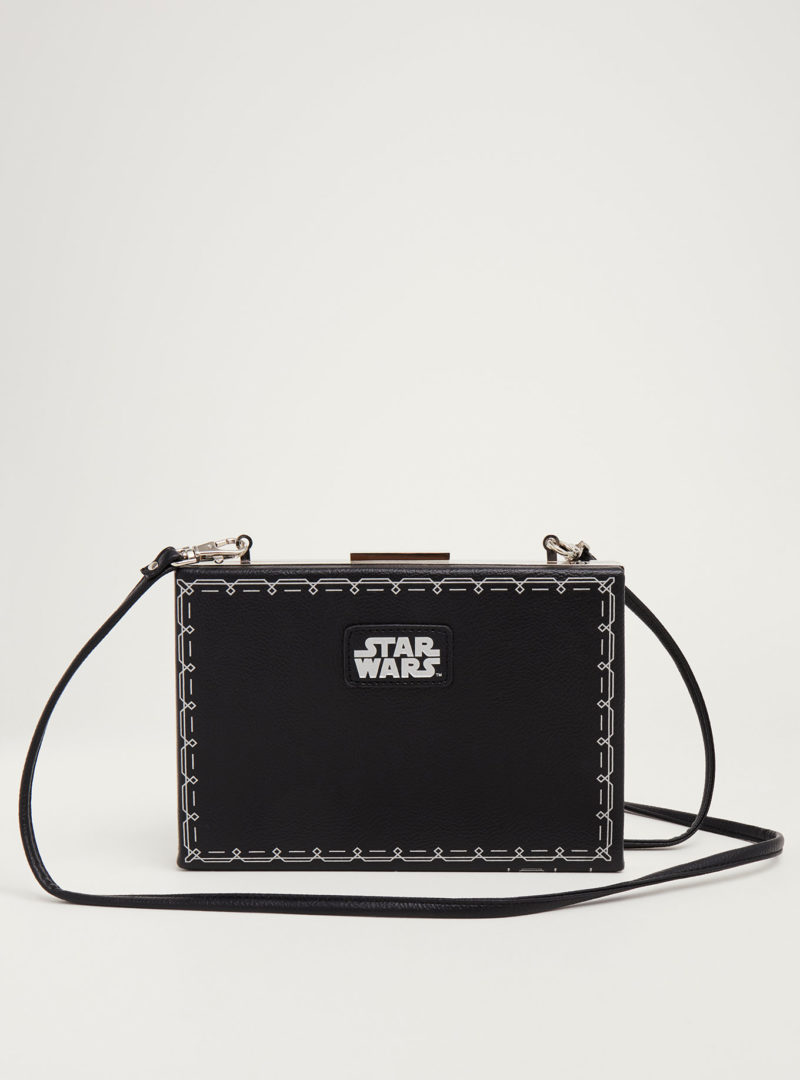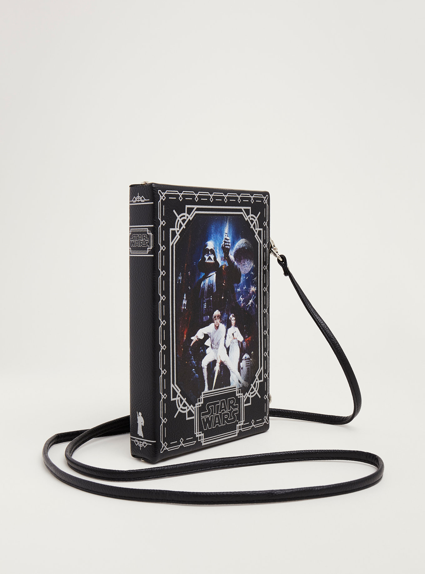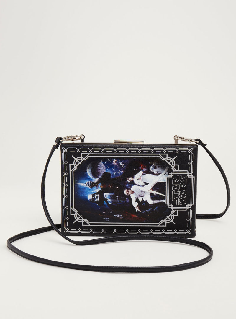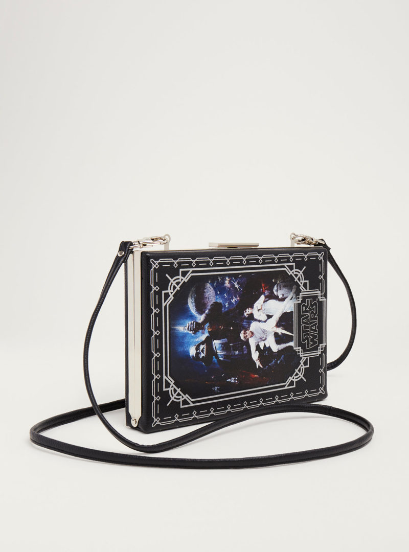 This women’s Star Wars book clutch is available at Torrid. The clutch is in the shape of a book, with Star Wars poster artwork by John Berkey on the front. Made from black faux leather, the clutch has a snap top style closure and a removable shoulder strap.