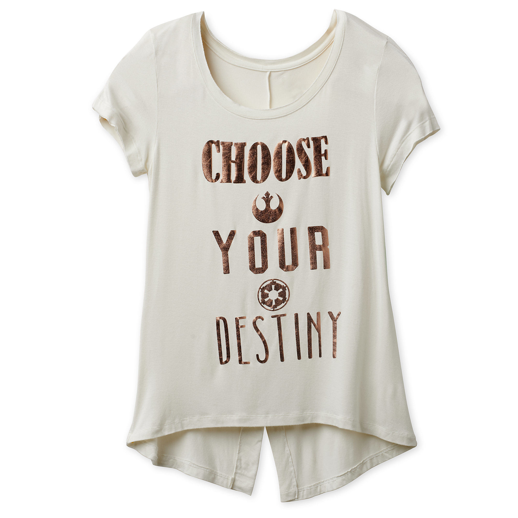 This new women’s Star Wars t-shirt is now available at Shop Disney. Made from 95% rayon / 5% spandex, the ‘natural white’ t-shirt features a metallic copper front print of the text ‘Choose Your Destiny’, along with the Rebel Alliance and Galactic Empire symbols. Part of the Star Wars Boutique Collection made for US Disney Parks, the lightweight t-shirt features raw hemmed sleeves, and a slit in the lower back hem for a looser draped fit.