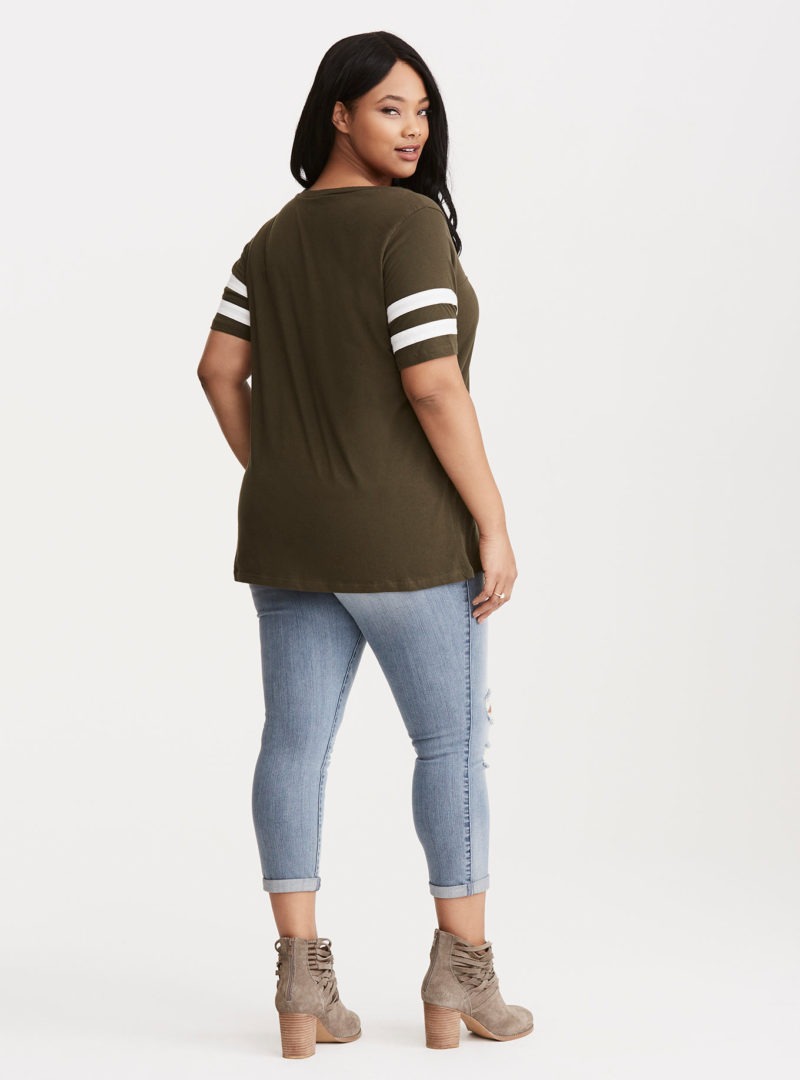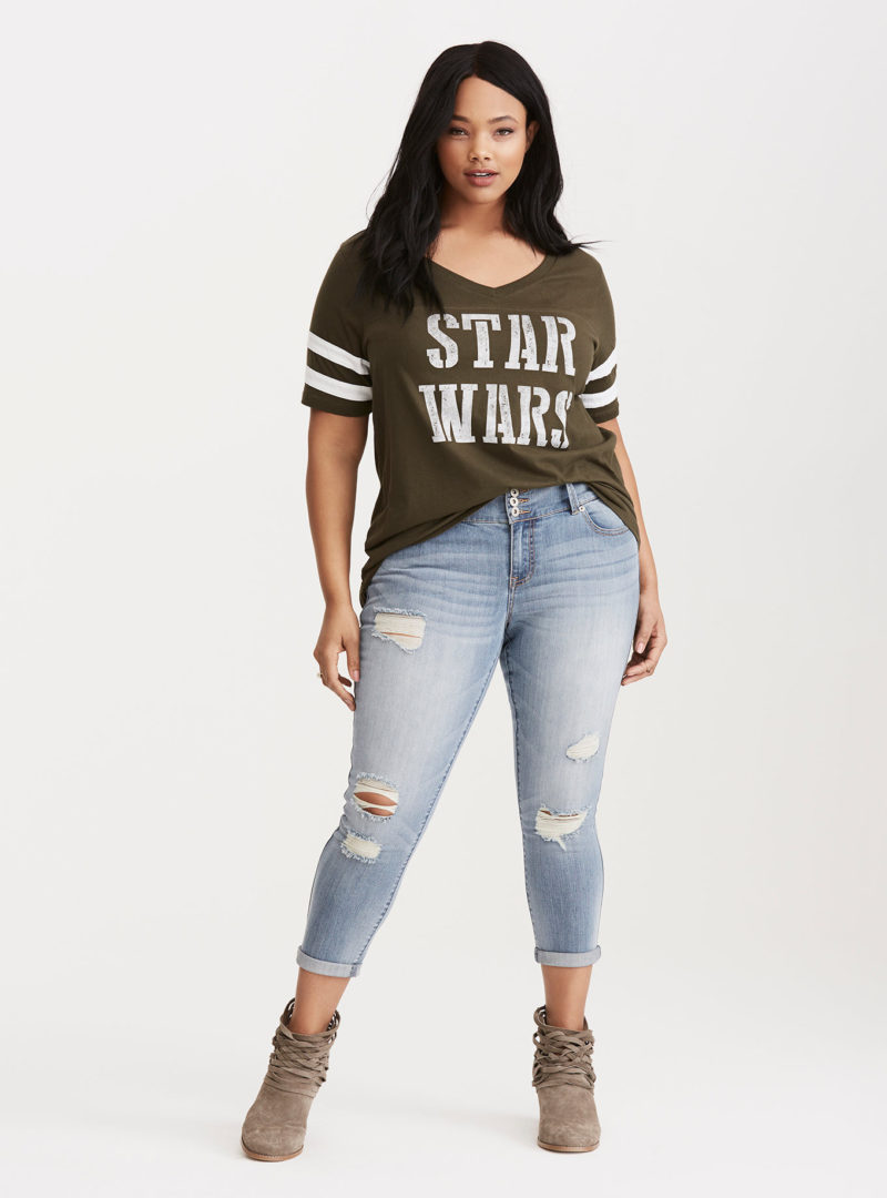 Torrid has a new women’ Star Wars plus size tee available. The olive green t-shirt features white stripes on the sleeves, while the front features the text ‘Star Wars’. The text print has a distressed, stencil style, which works well with the olive green t-shirt colour.
