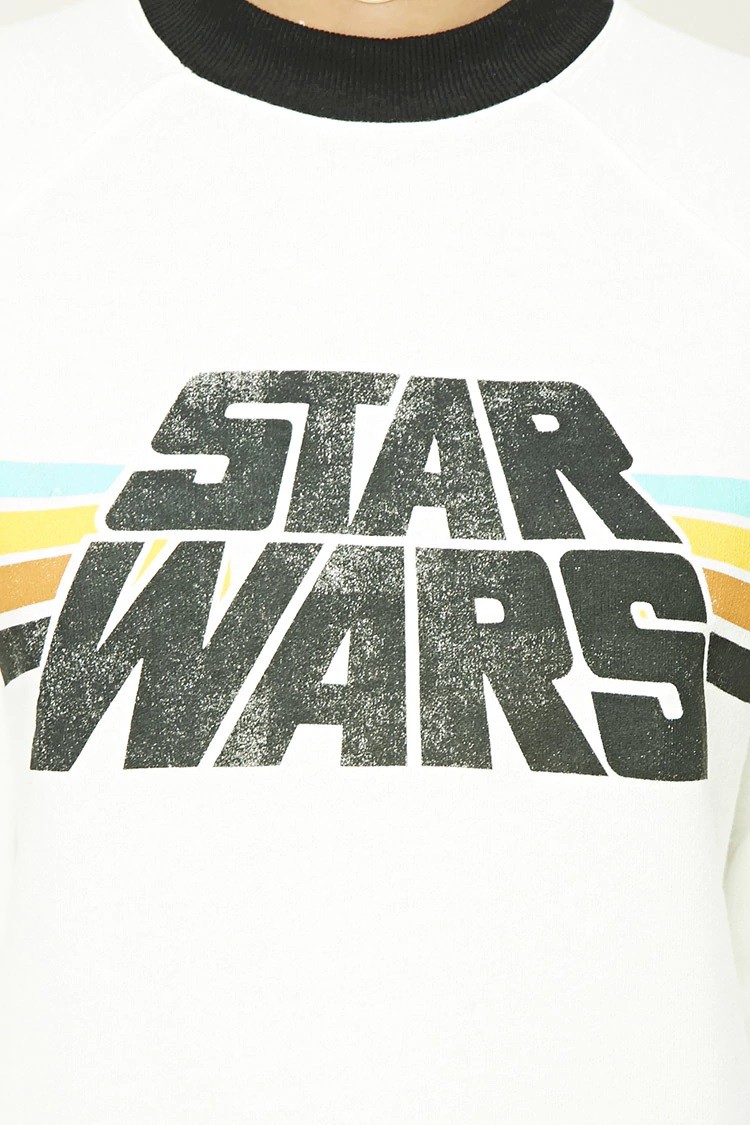 Forever 21 has a new women’s Star Wars sweatshirt available. The white sweatshirt is made from French terry knit, and features ringer style black ribbing at the neckline, sleeves, and lower hem. The front features a vintage style Star Wars logo with background stripes – the print has a distressed look, further adding to the vintage style.