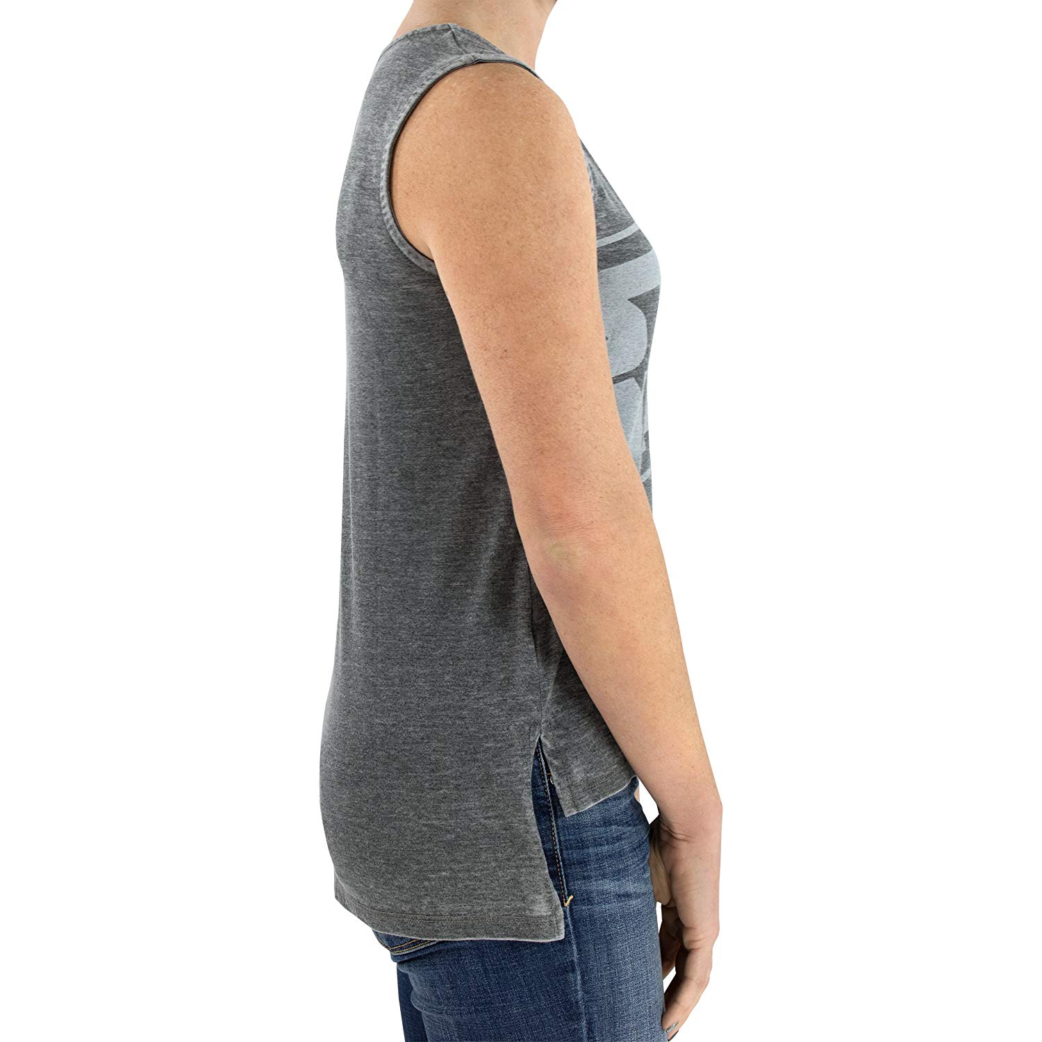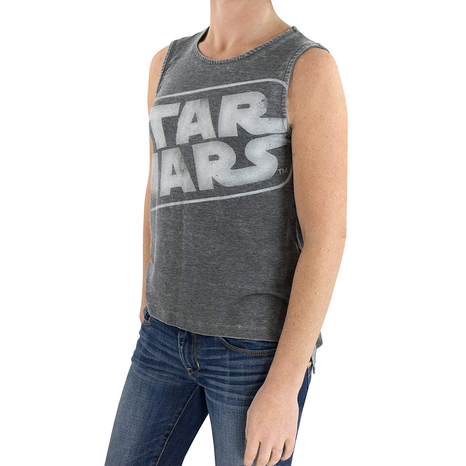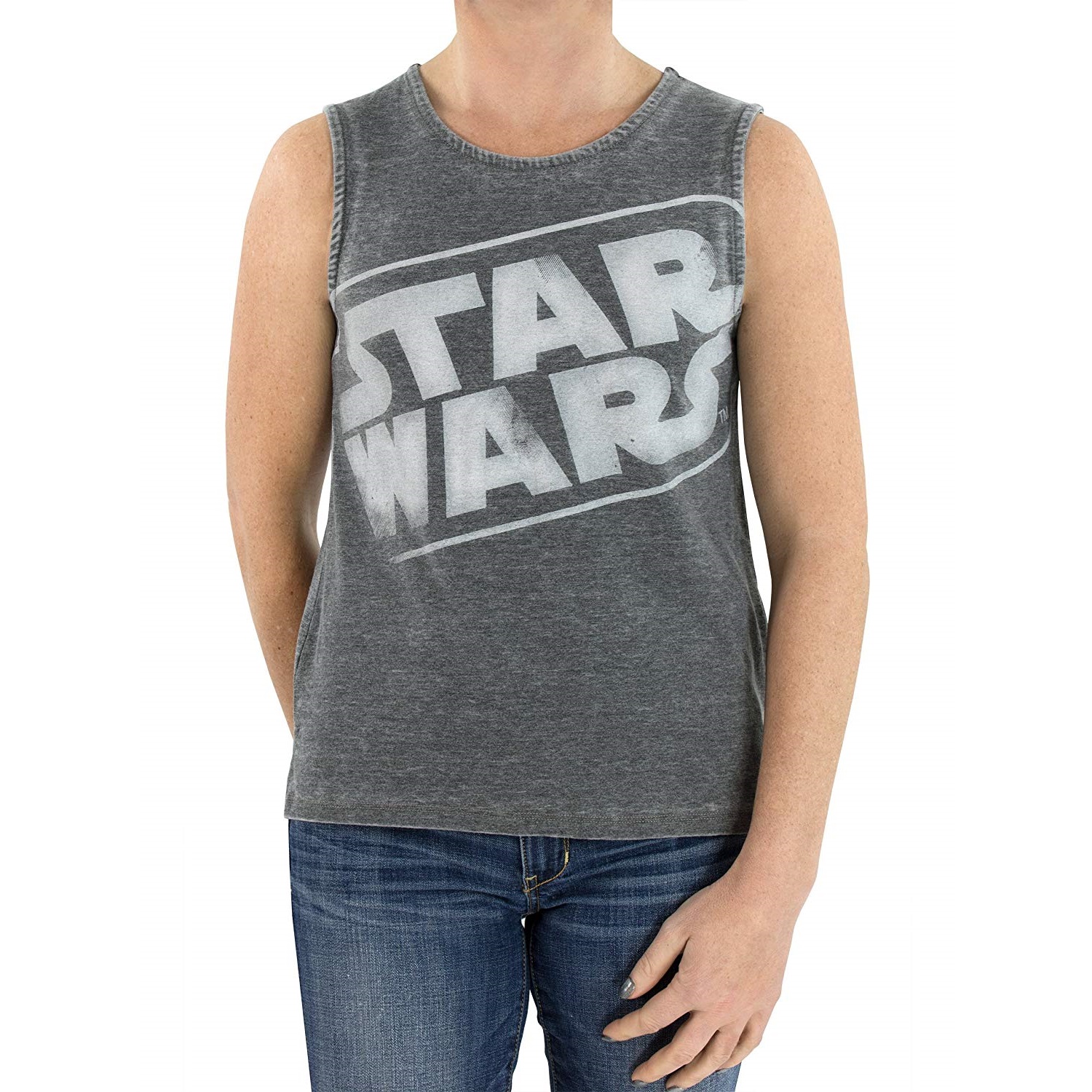 This women’s Star Wars logo tank top is available on Amazon. The heather grey tank top has a large front print of the classic Star Wars logo across the chest, with a weathered/distressed style. The tank top also has a high-low hem style, with a short split up the sides and a longer hem in the back.