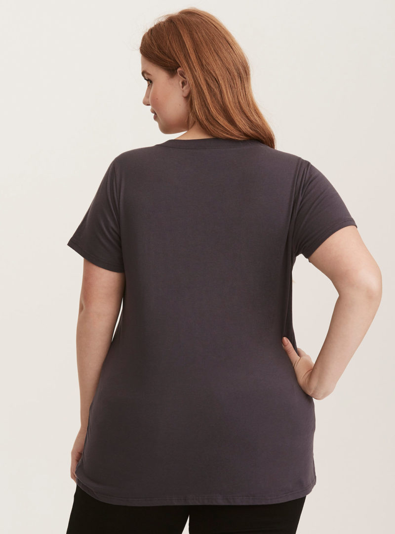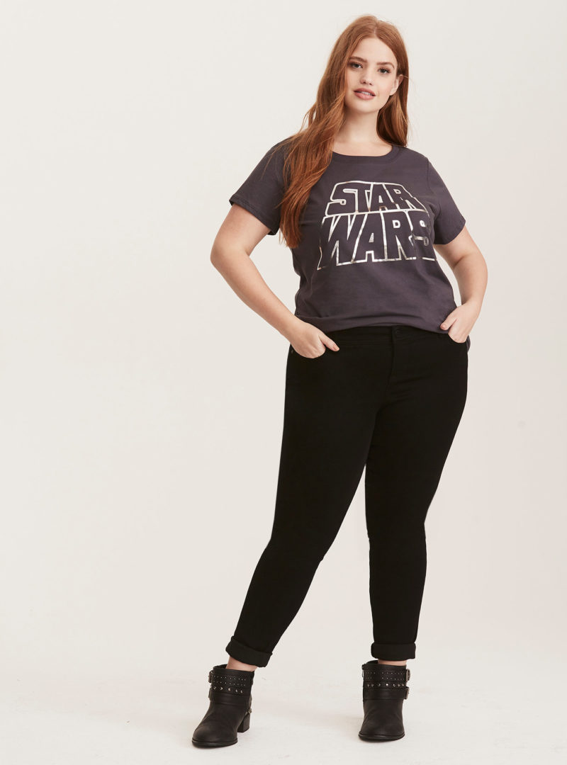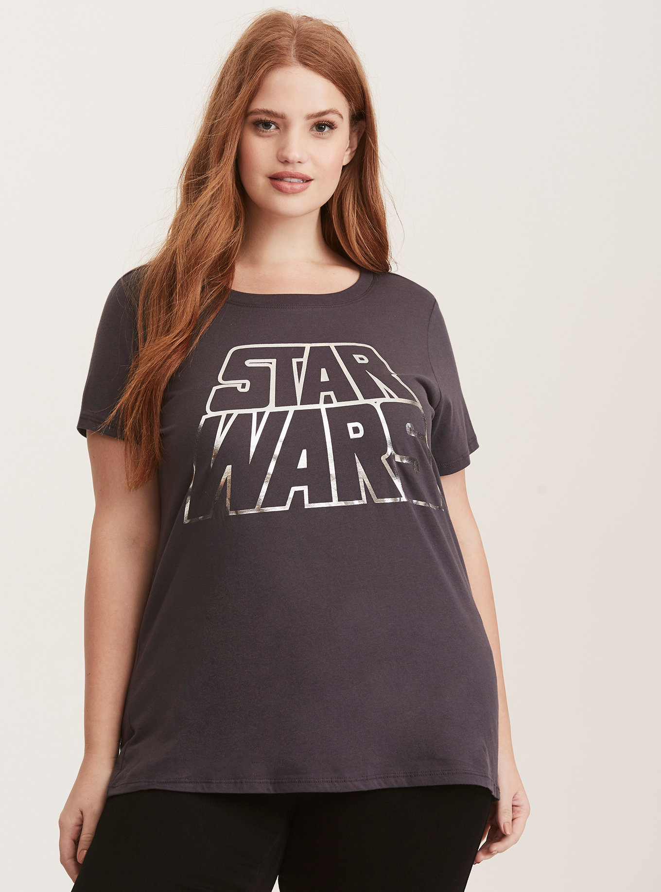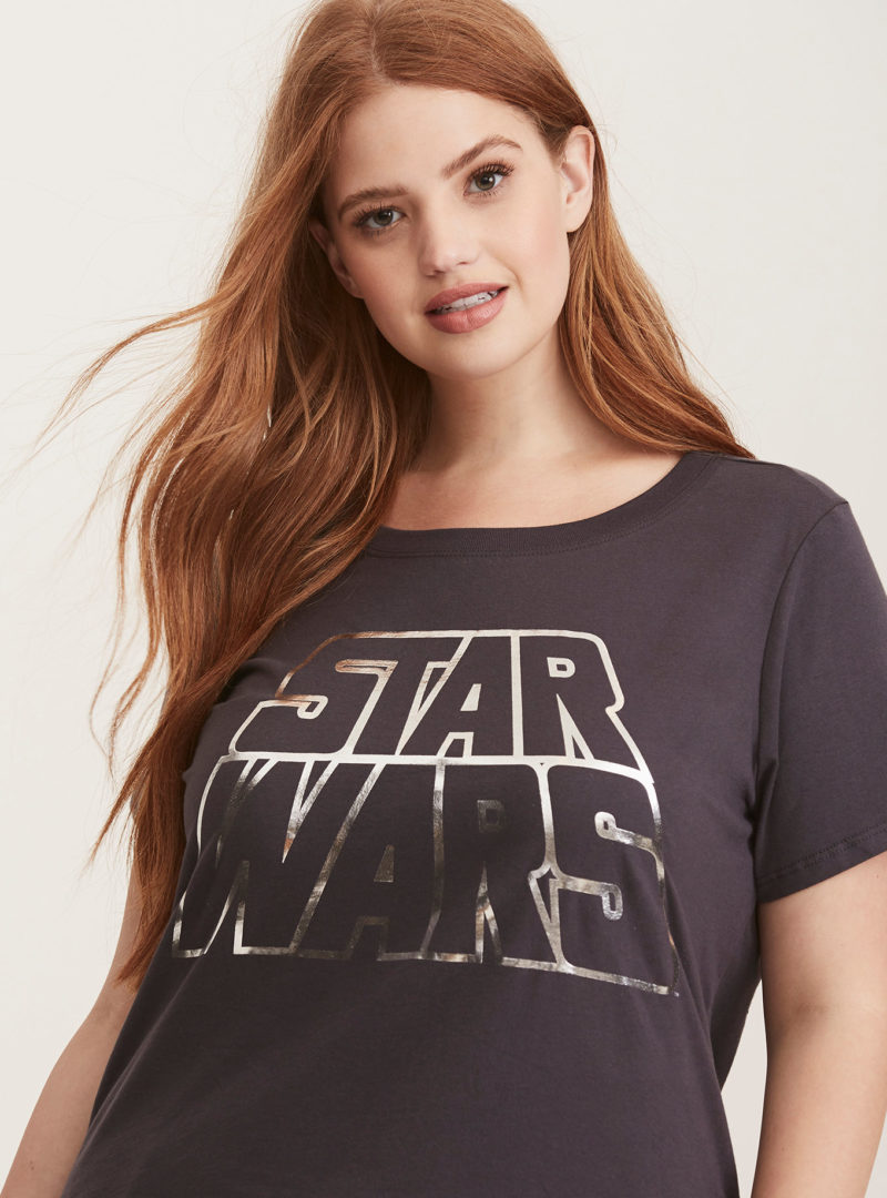 This women’s Star Wars metallic logo plus size t-shirt is available at Torrid. The charcoal grey plus size t-shirt has a crew neck style neckline and a front print of the Star Wars logo in metallic foil.