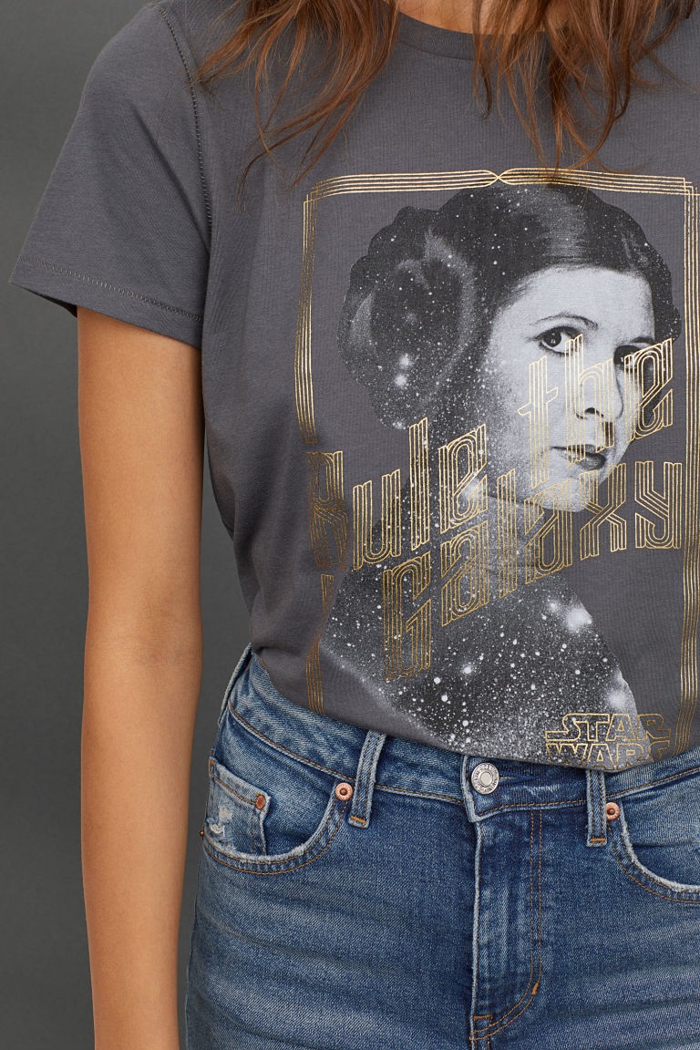 This beautiful women’s Star Wars Princess Leia t-shirt is now available at H&M. Made from 100% cotton, the grey t-shirt features a front print of Princess Leia, with the text ‘Rule The Galaxy’ in a metallic gold-toned accent. Of course I always *need* more Princess Leia shirts – and the gold accents are just gorgeous.
