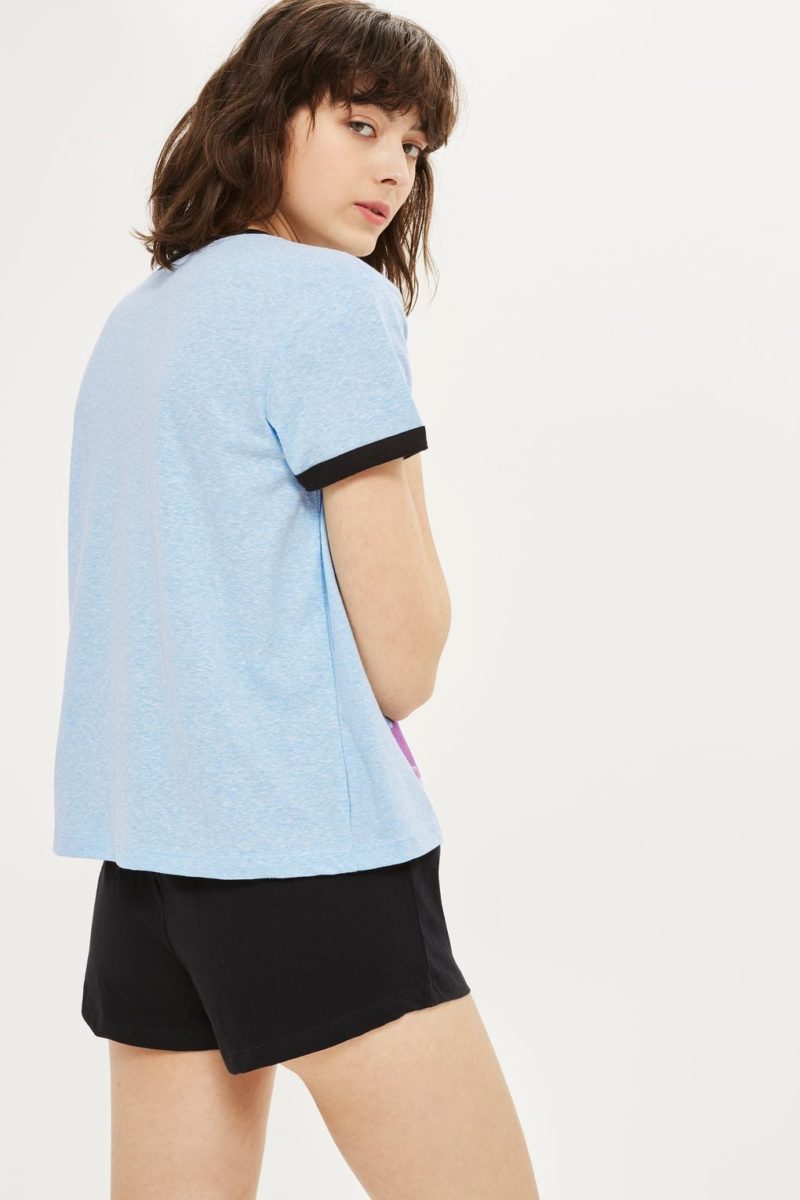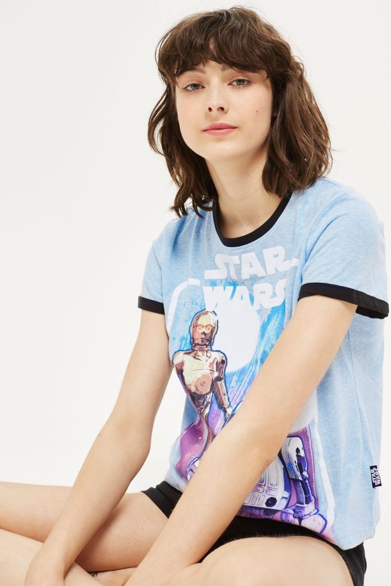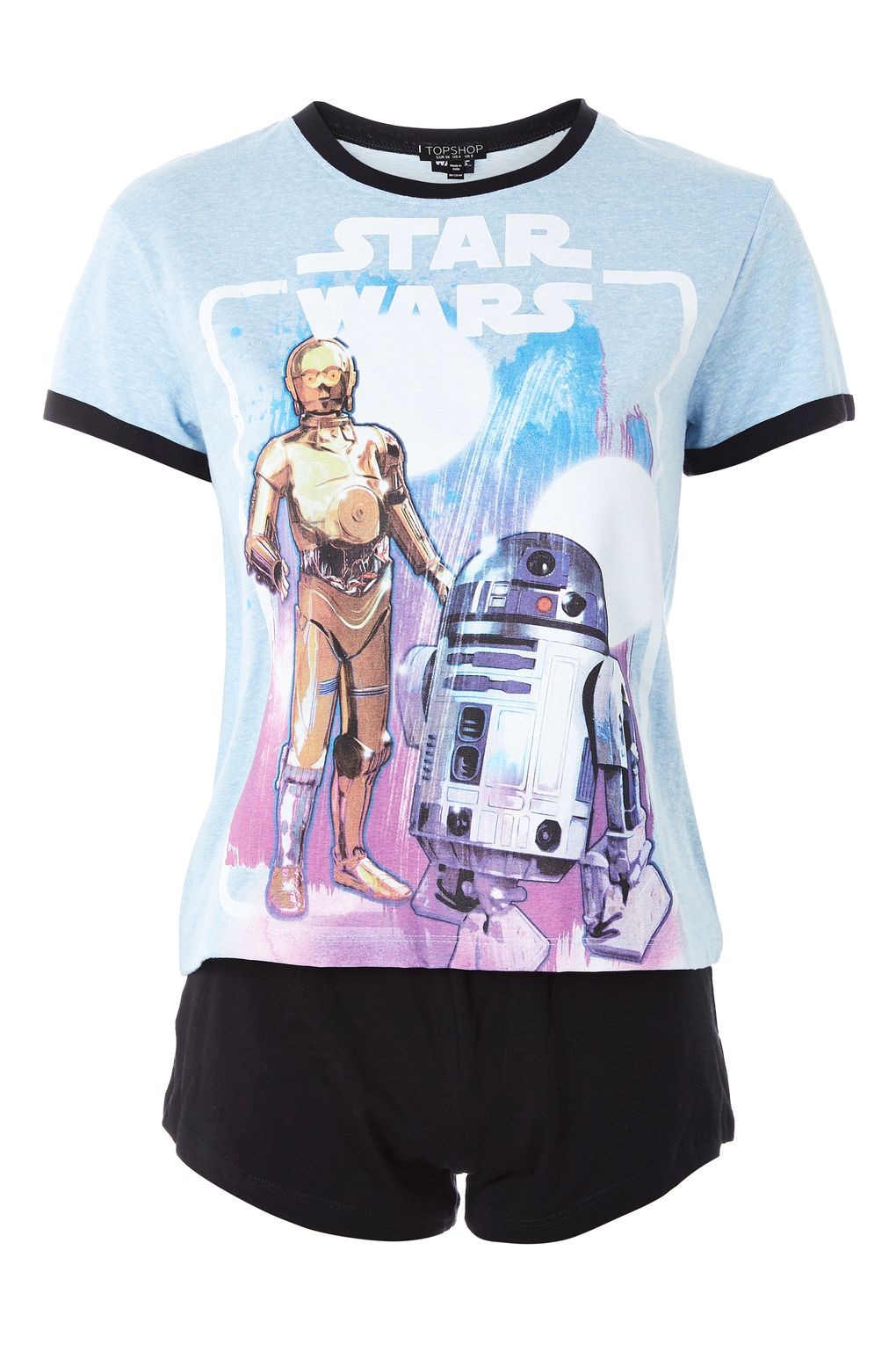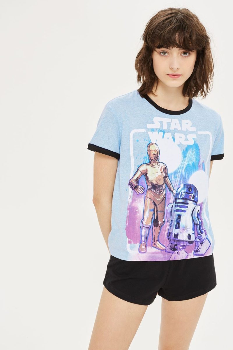 This women’s Star Wars pyjama set is now available at Topshop. The set includes a Star Wars printed sleep tee and plain black sleep shorts. The blue toned t-shirt features black contrast trim on the sleeve and neckline, and a front print of C-3PO and R2-D2 against a pink and blue watercolour style background.