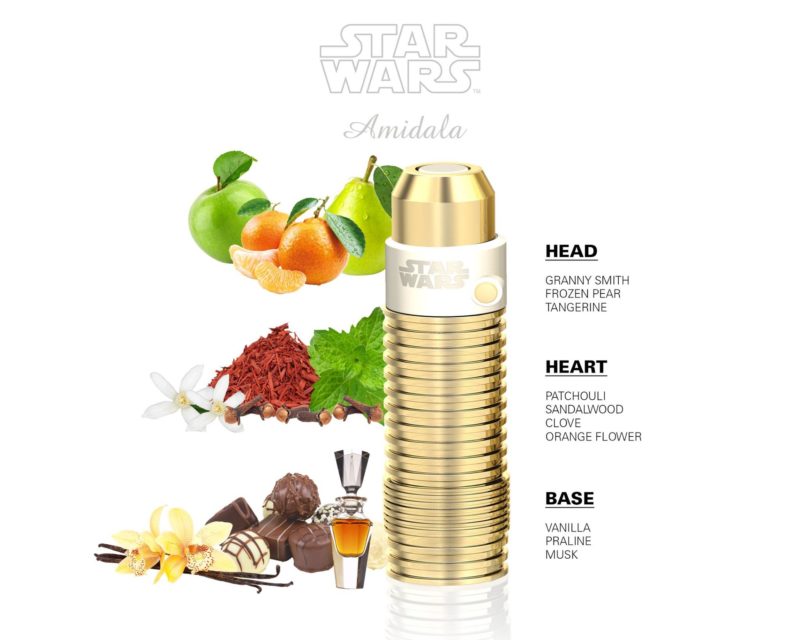 The only women’s fragrance in the series was inspired by Padmé Amidala, Queen of the Naboo. Amidala’s characteristic union of noble femininity and a strong, unconquerable will is reflected in this fragrance. Elegant sensual notes of vanilla, musk and patchouli are complemented by a fruity top note of apple and tangerine. The result is an elegant perfume with oriental and powdery notes, which makes its wearer irresistible.
