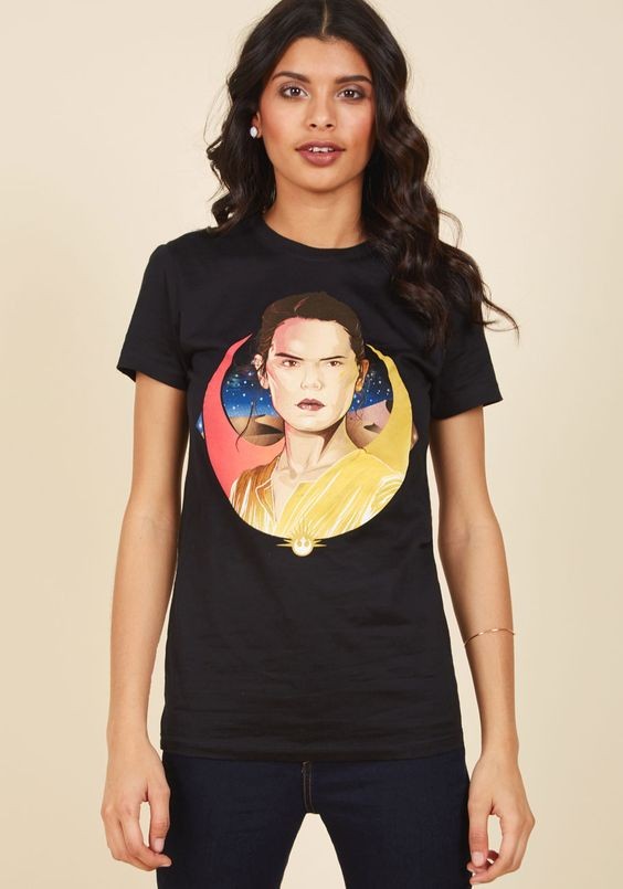 This women’s Star Wars Rey t-shirt is back at ModCloth. The black t-shirt is made from 100% cotton, and features a front print of Rey from The Force Awakens. The artwork is by Chrissy Cheung, and features the Resistance symbol, with the sands of Jakku in the background. This t-shirt was originally available at ModCloth back in late 2016, so it’s great to see it back again!