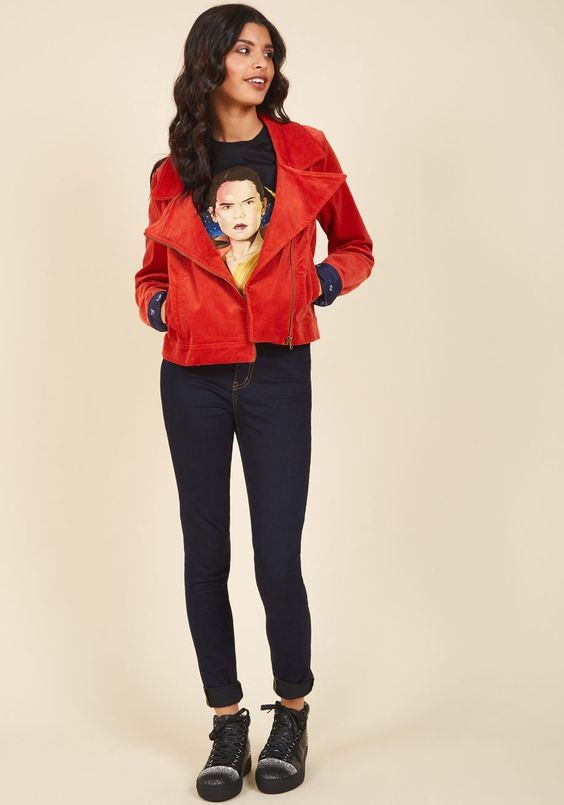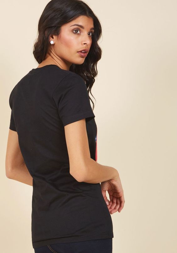 You make your stylish presence felt any time you appear on the scene in this black T-shirt! Emblazoned with a blue, yellow, and orange screen print of a proud heroine, this geek-chic top ensures your ensembles are always a fashion ‘Force’ to be reckoned with!