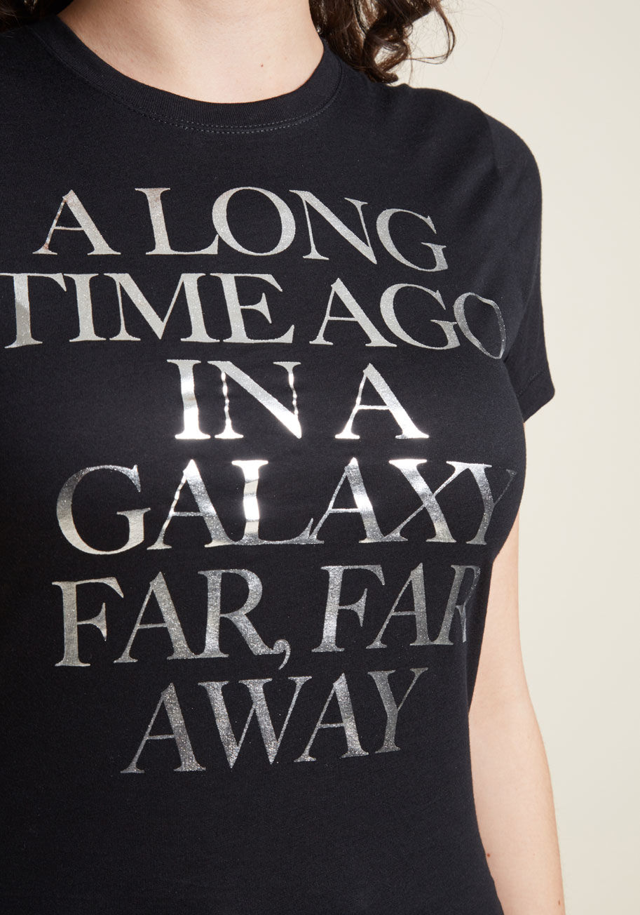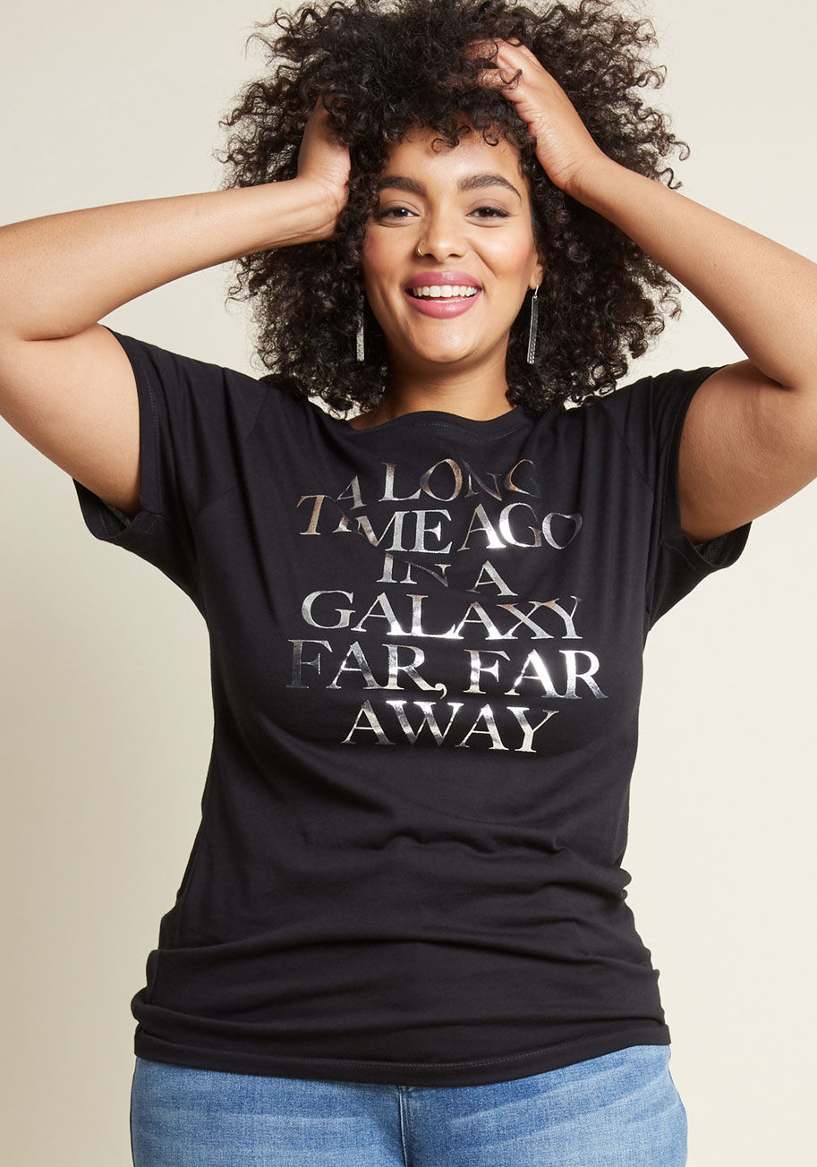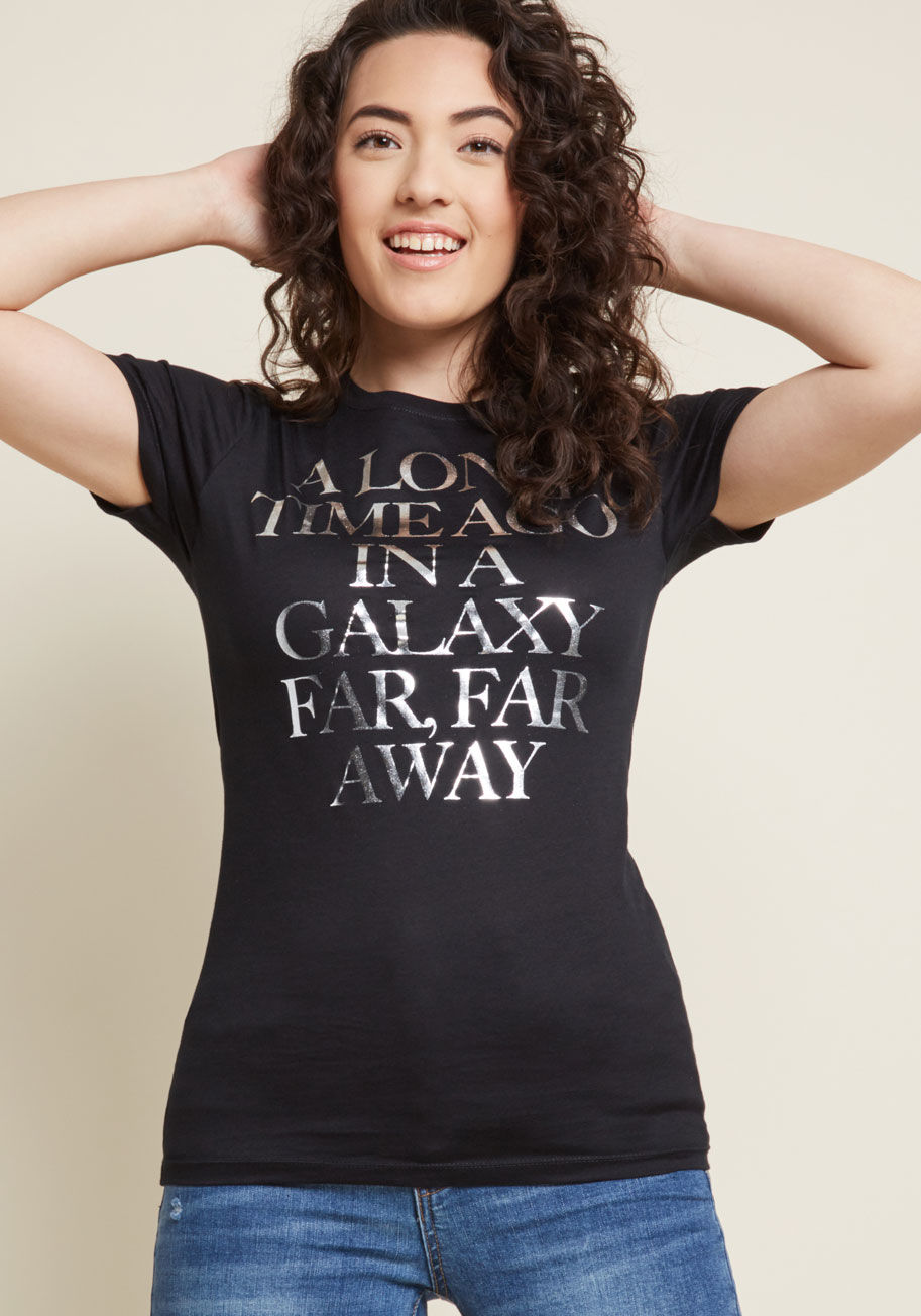 This women’s Star Wars silver text print t-shirt is available at ModCloth. Made from 100% cotton, the black t-shirt features a metallic silver print of the opening text ‘A Long Time Ago In A Galaxy Far, Far Away’. This t-shirt was previously available at ModCloth back in December 2016 – it’s quite fun to see it back again!