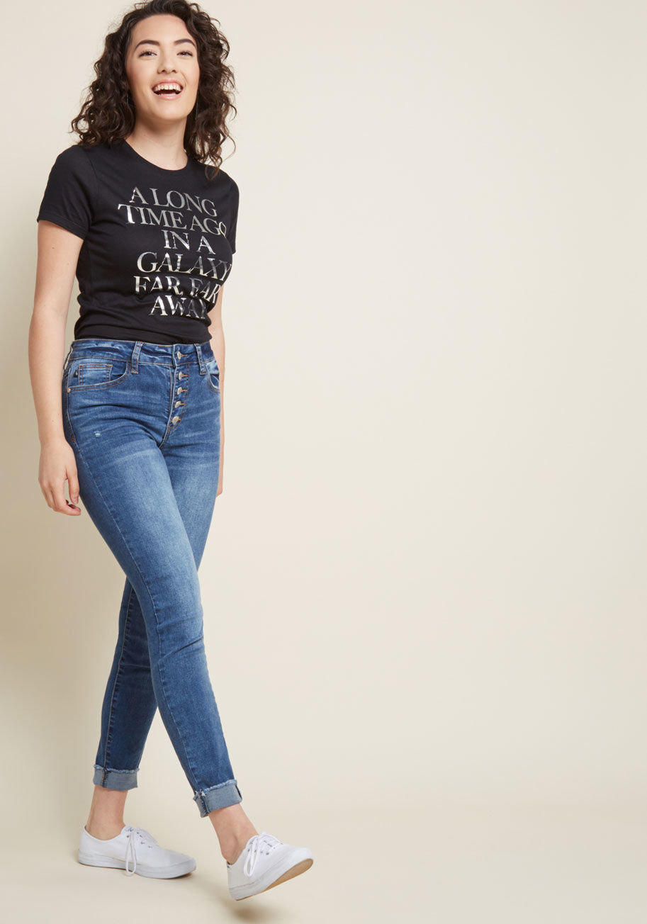 Ensure your geek-chic fashion efforts are always noticed by sporting this black T-shirt! Boasting a metallic silver screen print that stylishly announces where you’d rather be, this bold cotton top deserves top honors for proclaiming your favorite fandom in a most comfortable way.