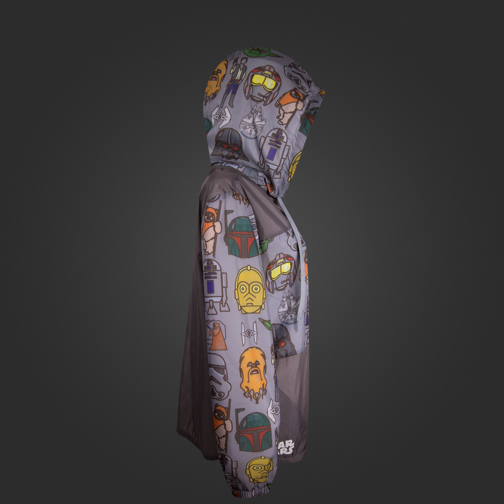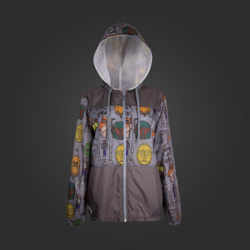 This women’s Star Wars windbreaker is now available at We Love Fine. Made from 100% polyester, the windbreaker features a ‘sketchy’ style print of Star Wars characters and vehicles including R2-D2, C-3PO, Han Solo, Boba Fett, Darth Vader, Stormtrooper, and even Wicket. The front has a full-length zip, and the hood is adjustable with drawstring ties.