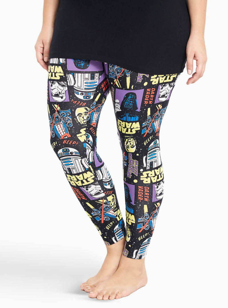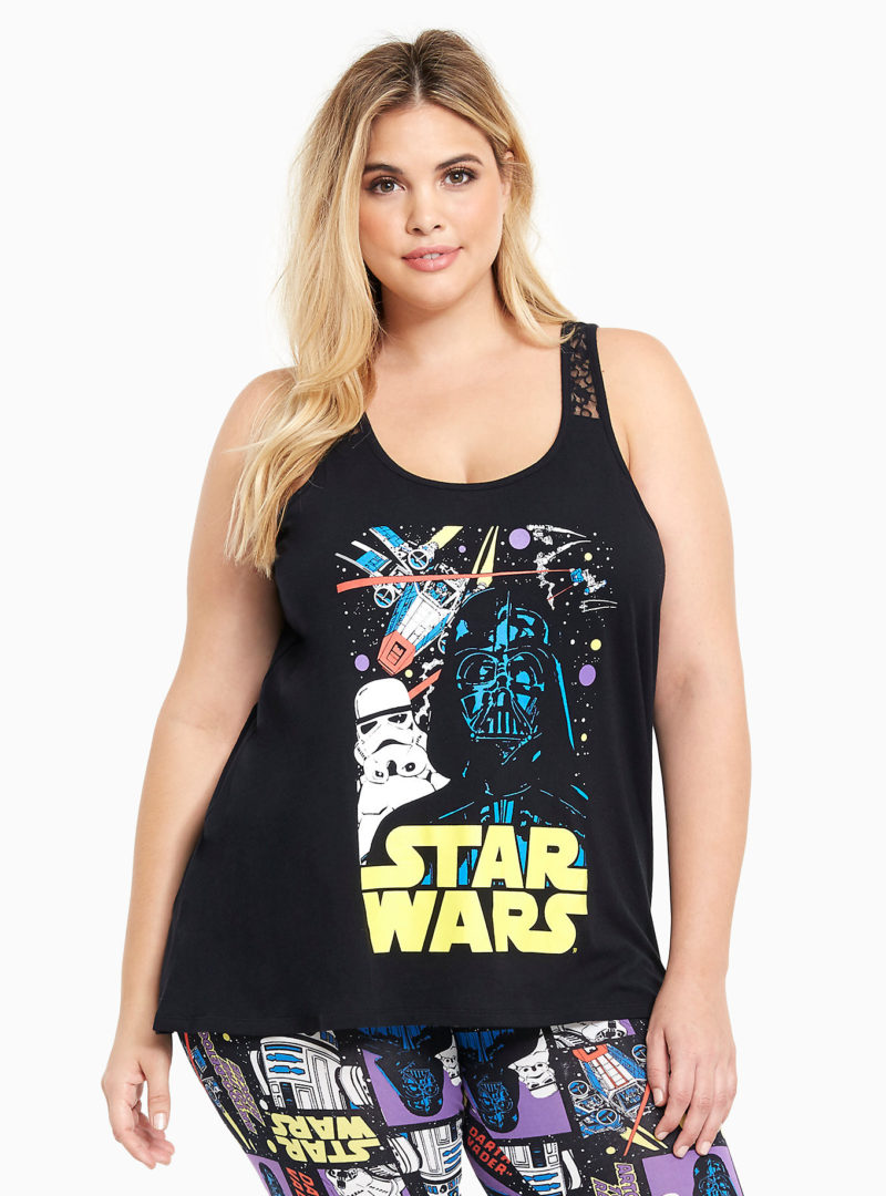Torrid has a new set of women’s Star Wars sleepwear available. The set includes a tank top and leggings (sold separately), which feature colourful Star Wars comic artwork. The women’s black sleep tank features a lovely black lace inset at the shoulders, and a large print on the front. The women’s sleep leggings feature an all-over repeating print of artwork including Darth Vader, R2-D2, C-3Po, Stormtroopers, and vehicles.