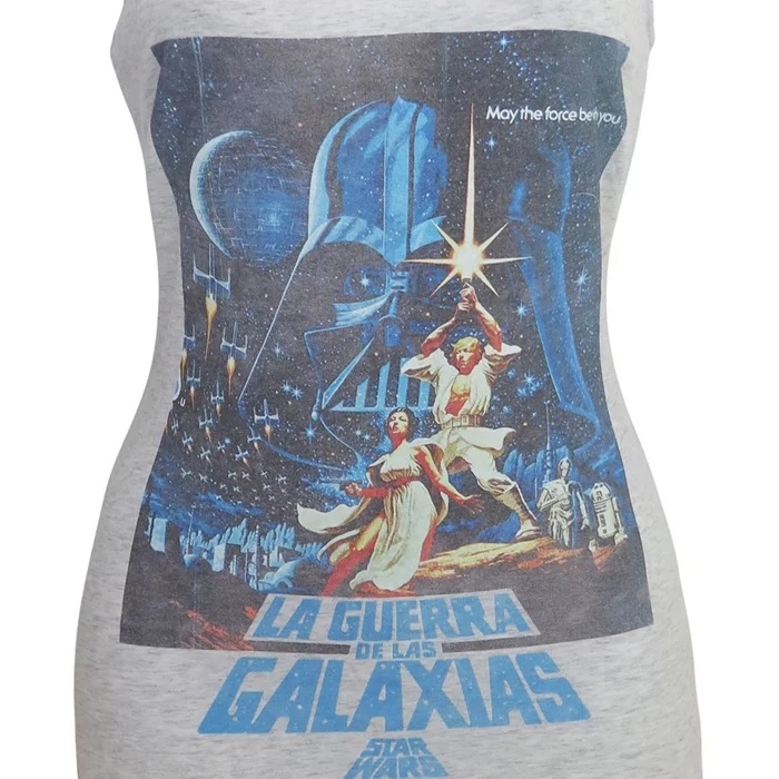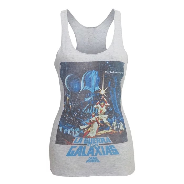 This women’s Star Wars Spanish tank top is now available at SuperHeroStuff. The heather grey tank top features a front print of the classic Hildebrandt brothers A New Hope poster artwork, with the text ‘Star Wars’ printed in Spanish – ‘La Guerra de las Galaxias’.