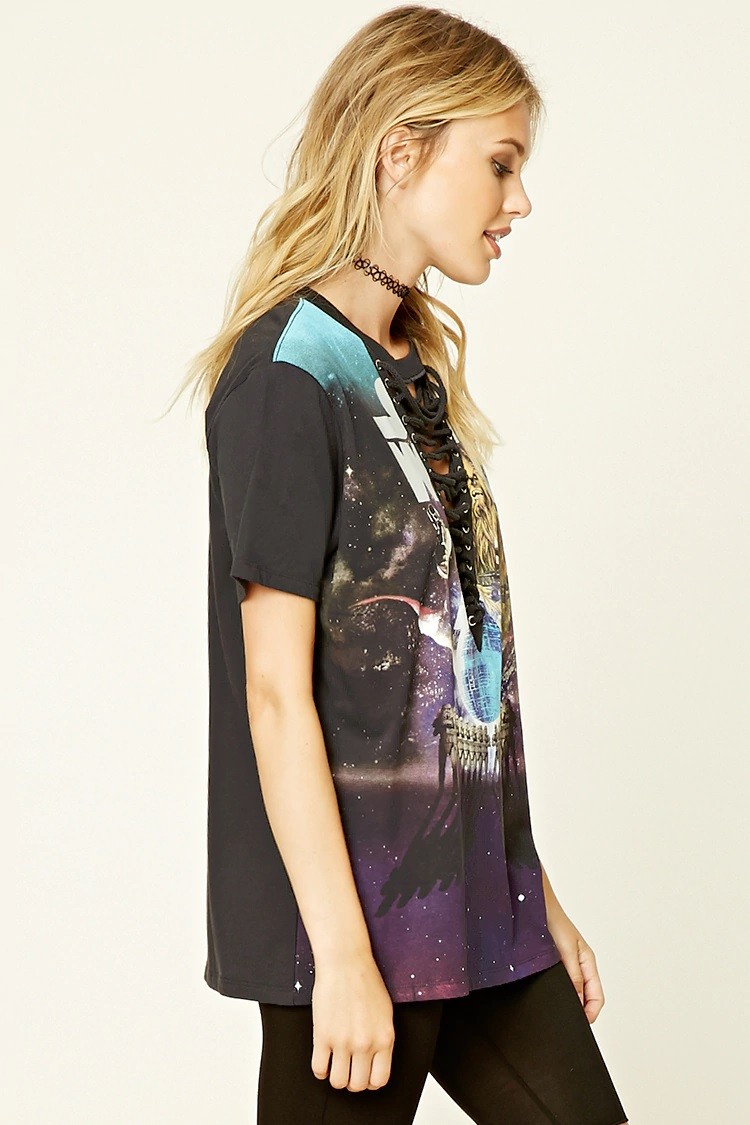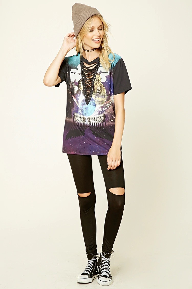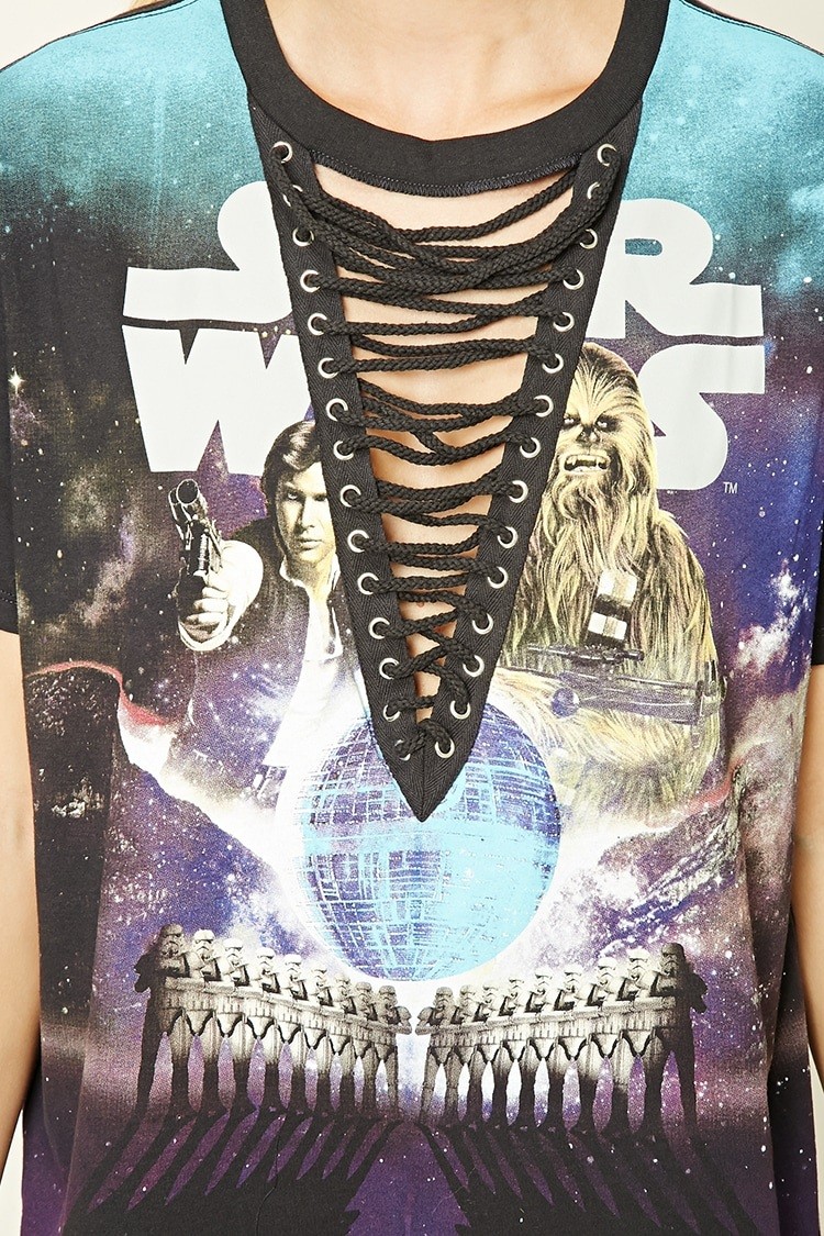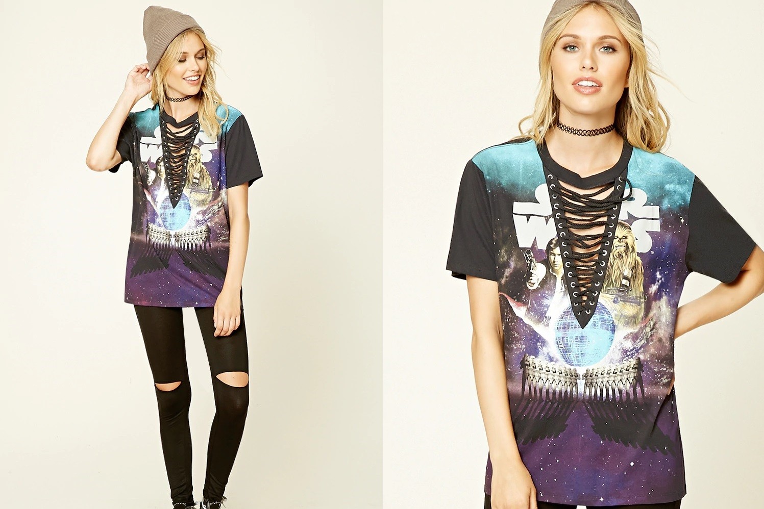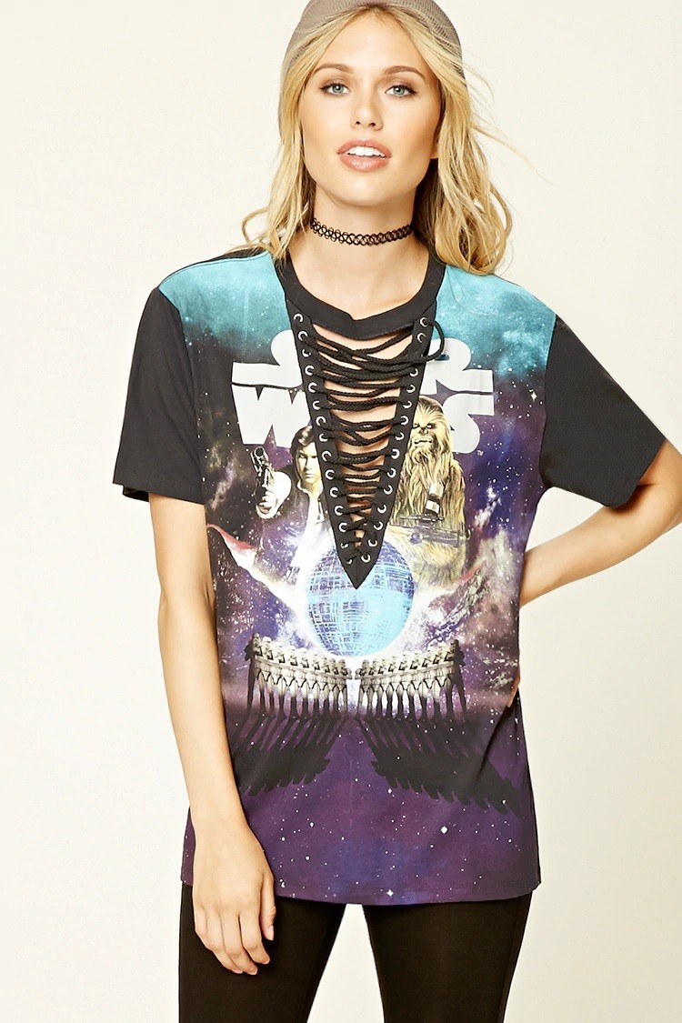 Okay, I really love this new find – a women’s Star Wars strappy graphic tee at Forever 21! The women’s black t-shirt features a full front print of Han Solo and Chewbacca with the Death Star and Stormtroopers, with a great laced up strappy insert! I just love unique features like this, it adds such a point of difference to an otherwise standard t-shirt.