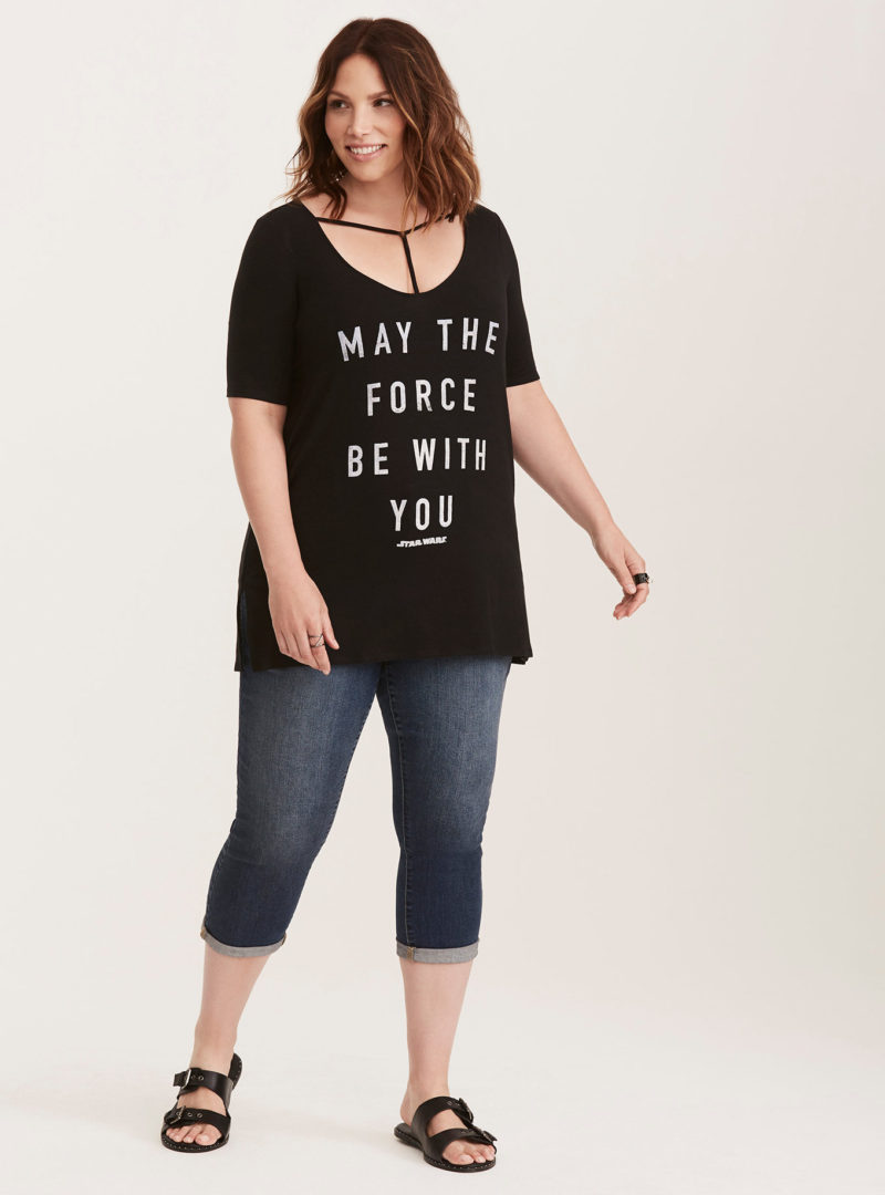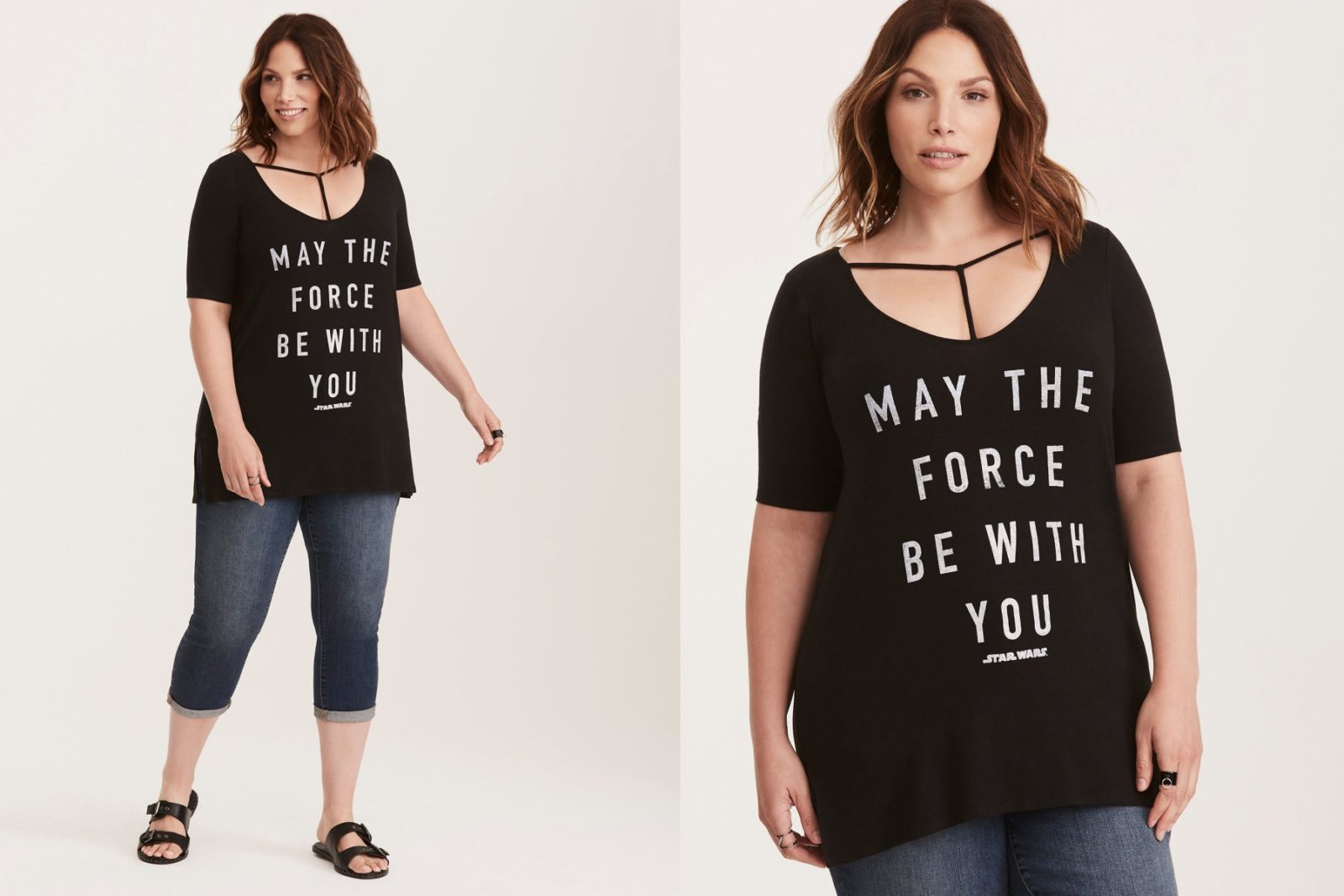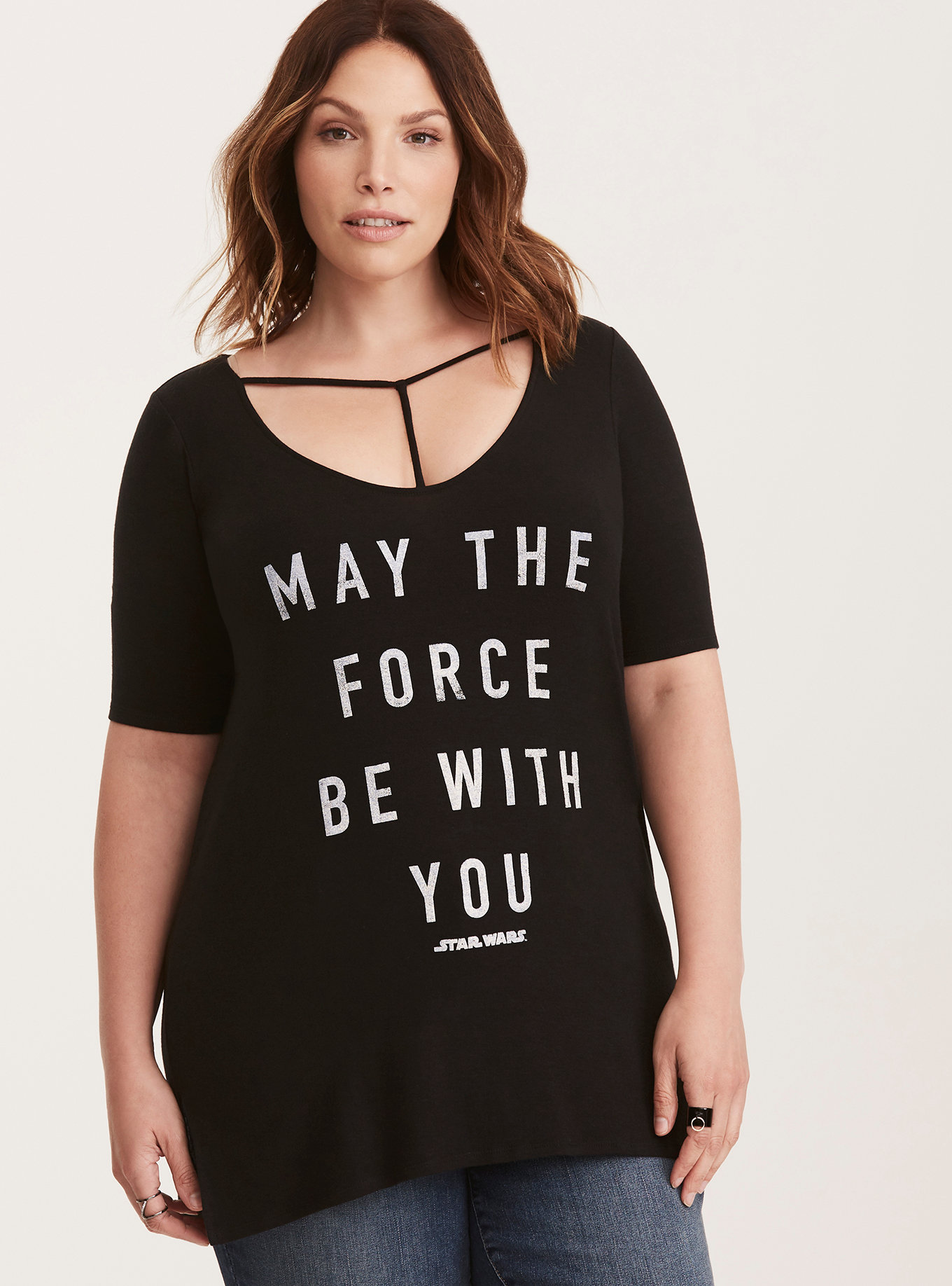 This new women’s Star Wars strappy plus size t-shirt is now available at Torrid. The black t-shirt features the classic Star Wars quote ‘May The Force Be With You’ printed on the front, and a t-bar strap detail in the v-neckline.