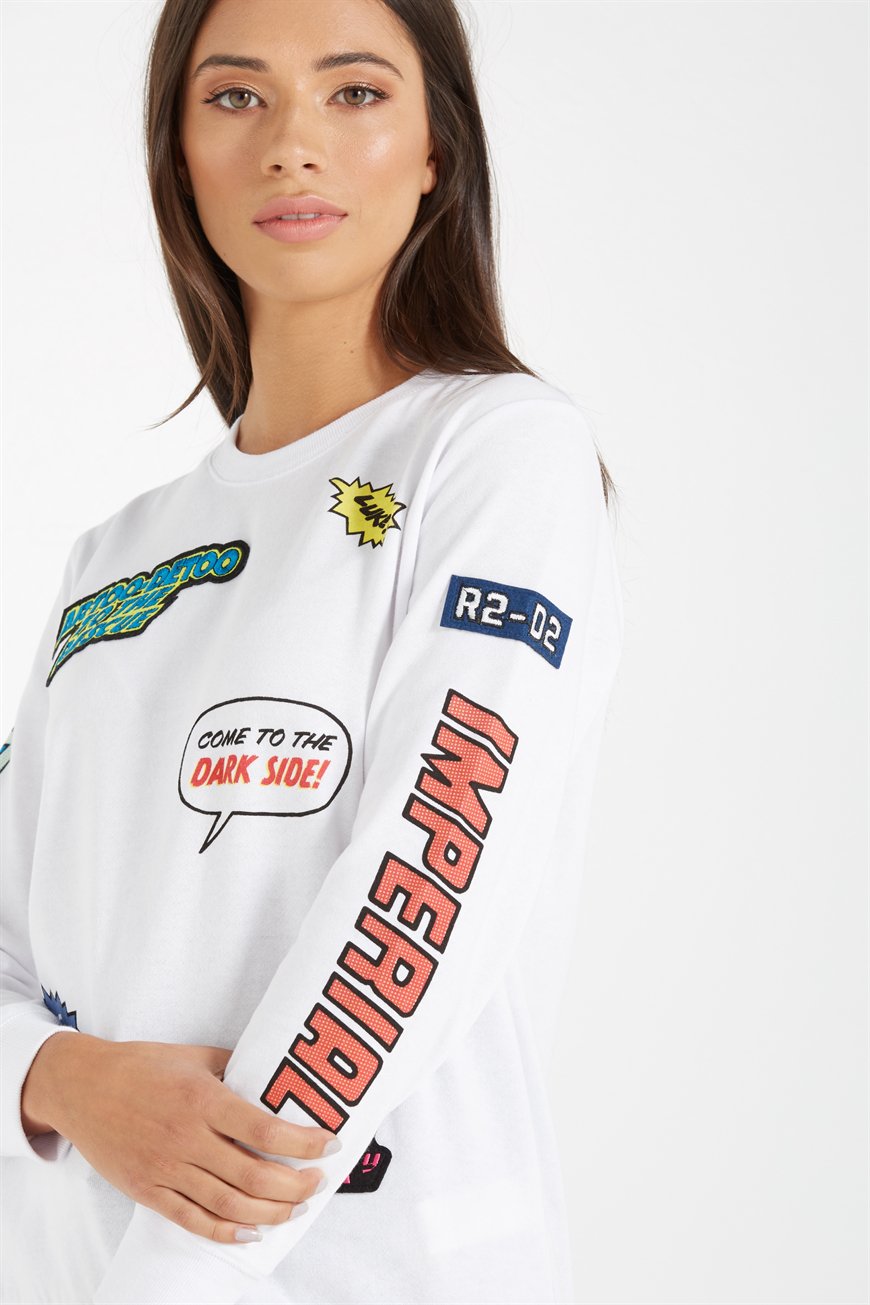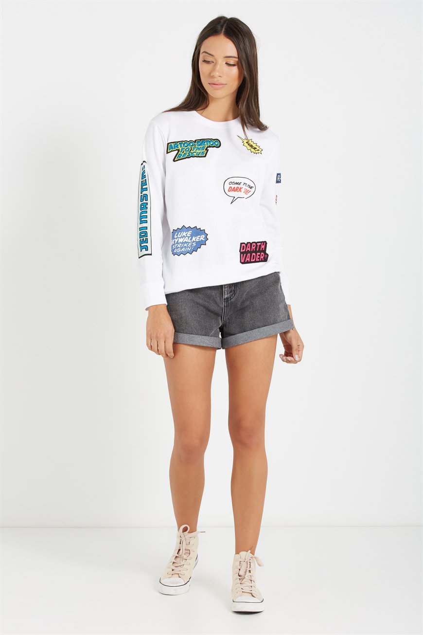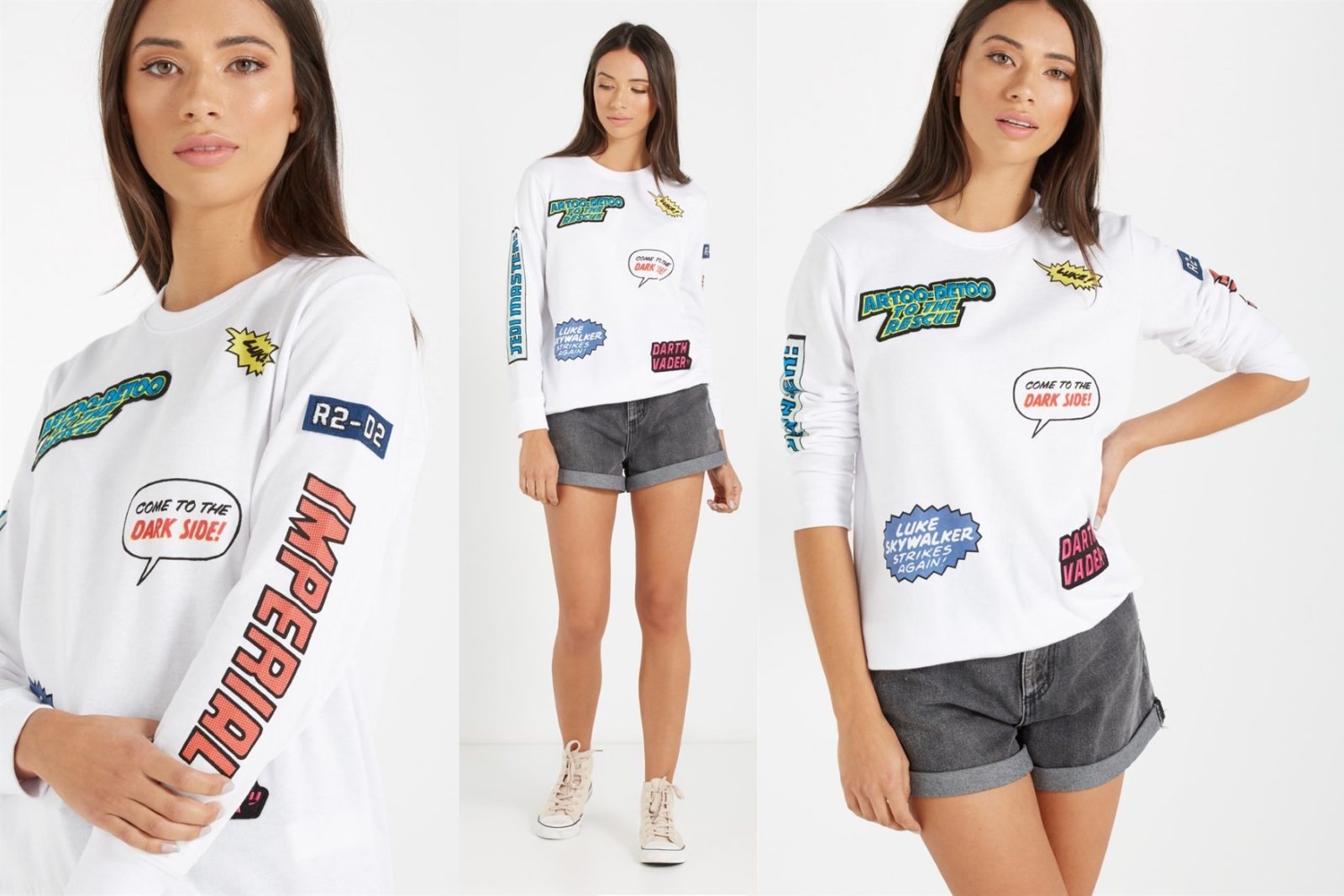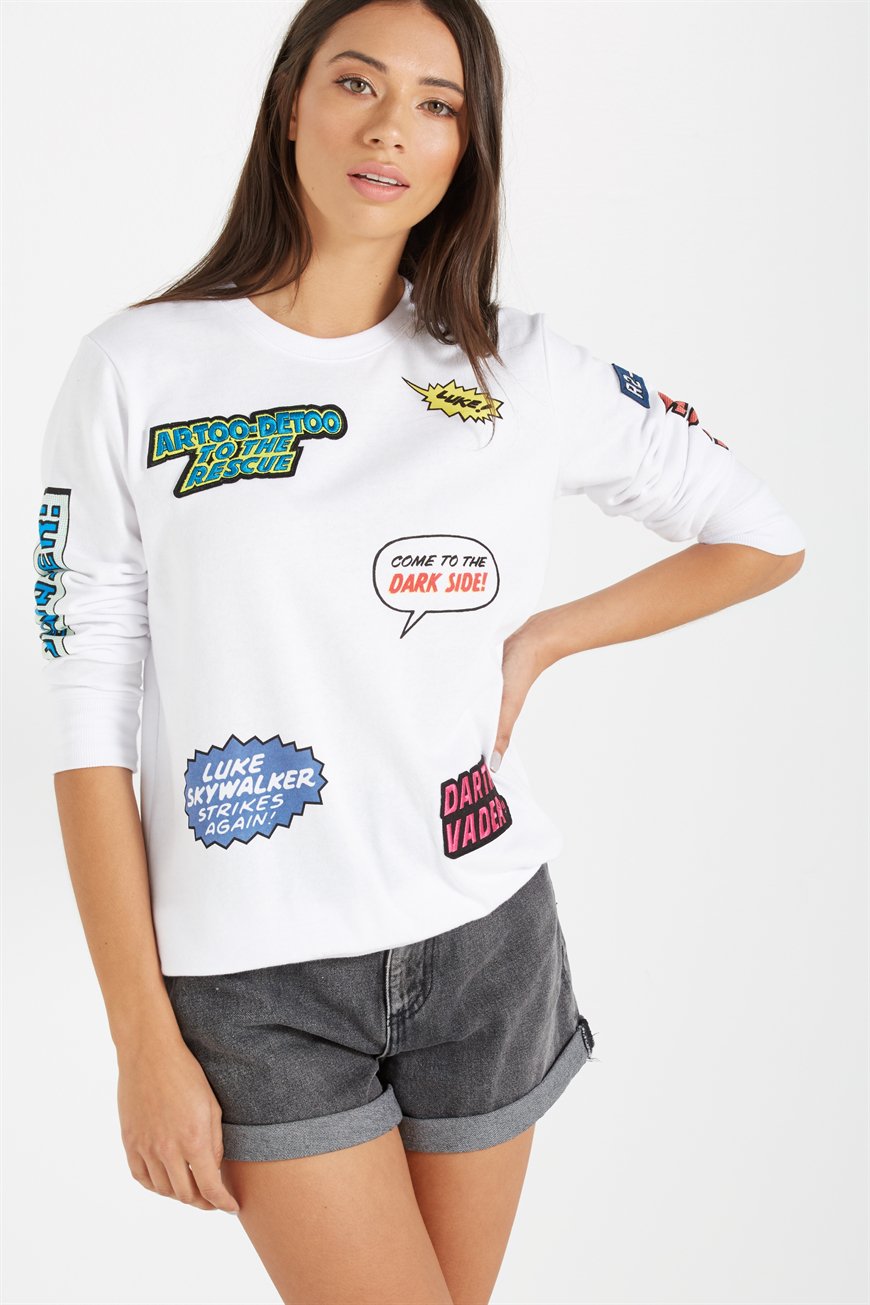 This women’s Star Wars sweatshirt is available at Cotton On NZ. The white sweatshirt feature scattered printed text and quotes, along with several fully embroidered patches. The designs include ‘Artoo-Detoo To The Rescue’, ‘Come To The Dark Side’, and ‘Luke Skywalker Strikes Again!’.