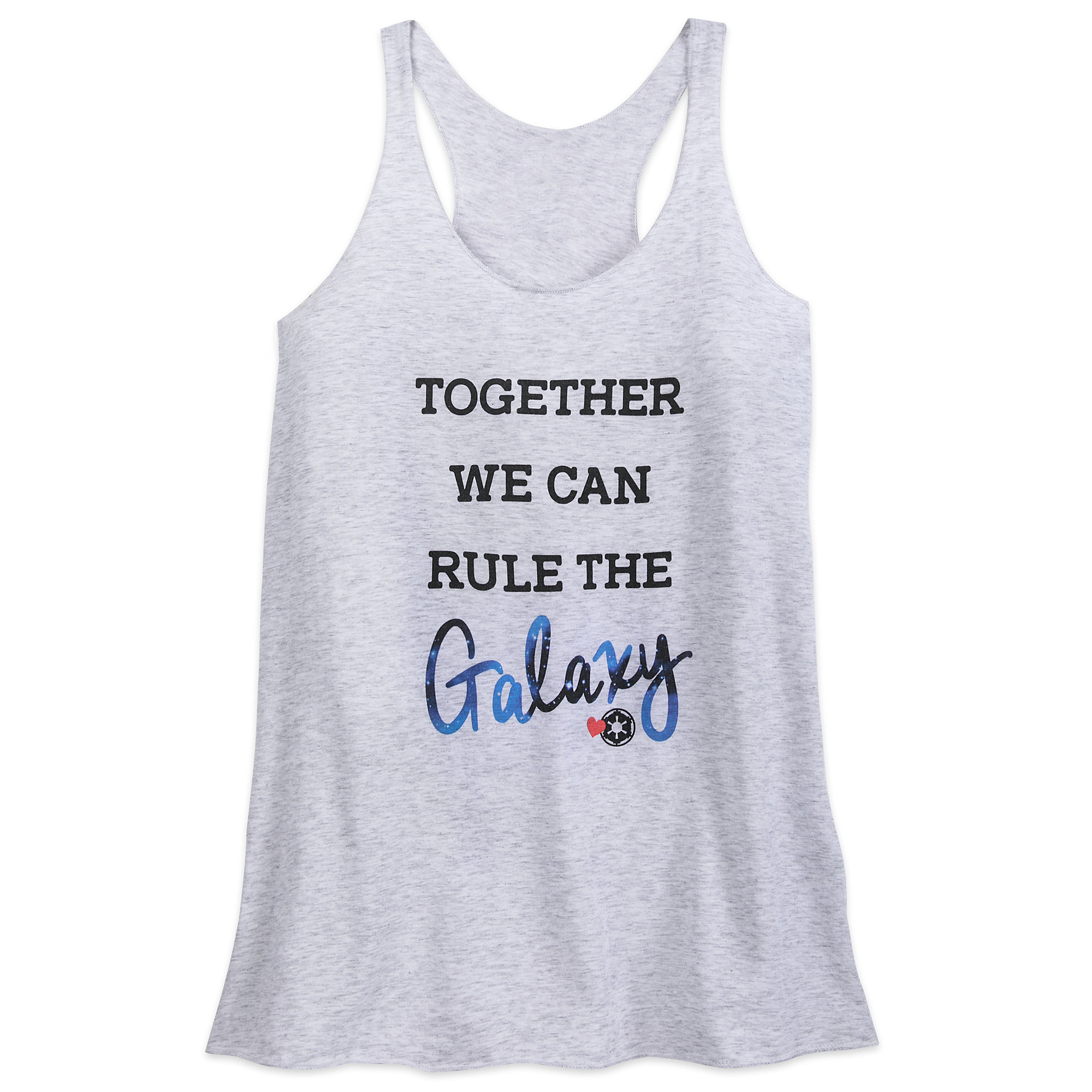 This women’s Star Wars tank top is now available at Shop Disney. The grey heather tank top has a racerback style cut and features a front print of the Darth Vader quote ‘Together We Can Rule The Galaxy’. The text design is accented with a small Imperial ‘cog’ symbol with a little heart – a perfect top to wear with your significant other.