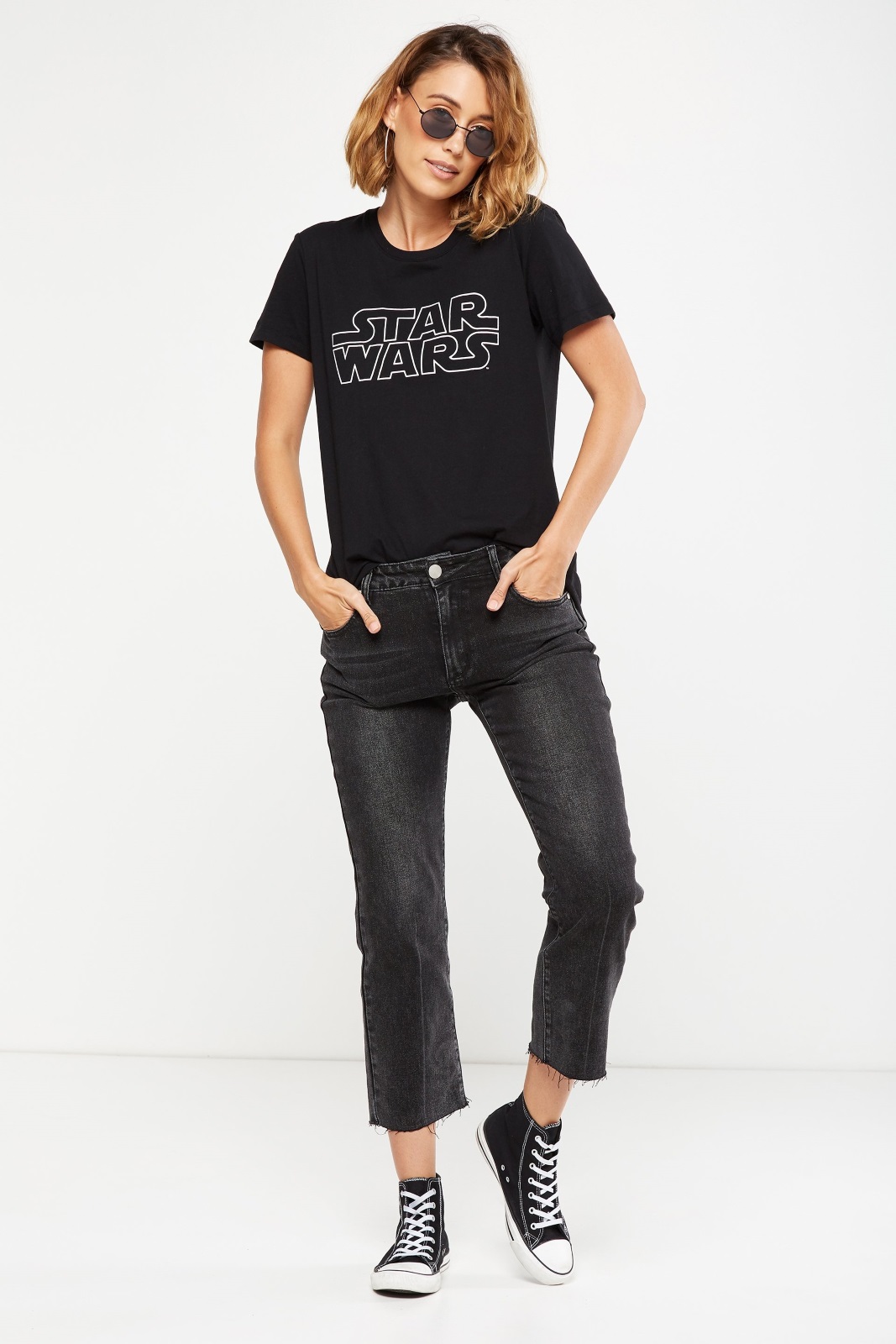 This women’s Star Wars logo t-shirt is now available at Cotton On NZ. The women’s black t-shirt features the classic Star Wars logo printed on the front. Straight and to the point, a classic black tee coordinates so well in everyone’s wardrobe.